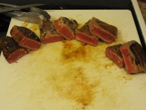 Tonight we made seared tuna salads. We experimented with four different types of rubs/marinades for the tuna steaks. These included soy sauce, crushed black pepper and garlic powder, old bay and mexican chili. They were all delicious in their own right and it was fun to get different flavors with each bite.