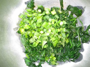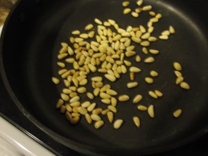 For the topping Greg started off by wilting the spinach and adding some green onions, toasted pine nuts and feta.