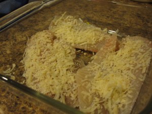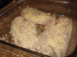 For the tilapia he “breaded” it with some parmesan, put the topping on each fillet, and baked for about 10-15 minutes.