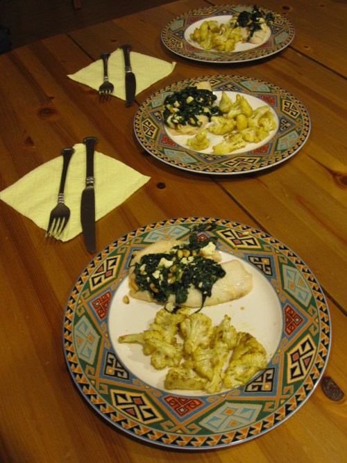 Tonight we made our version of Mediterranean Tilapia and it is a really easy recipe and tastes great. I call it ‘mediterranean’ only because we used feta cheese and pine nuts but really you can put pretty much anything you want into the topping and it should go well with the subtle flavor of the tilapia.
