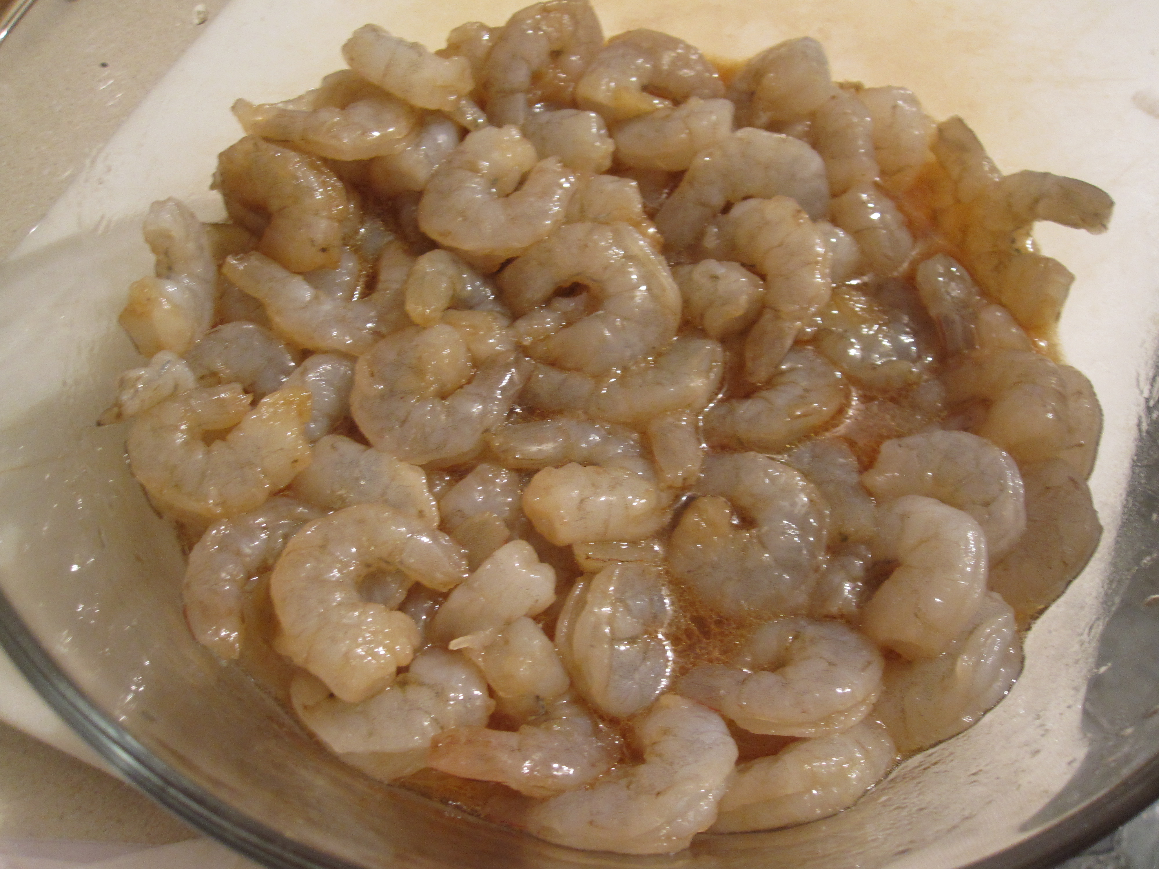 Making the dish was pretty easy. First, I marinated the shrimp in soy sauce, sesame oil, rice wine, egg whites and salt. I’d never seem a marinade with egg whites in it before and I’m still not sure of the purpose.