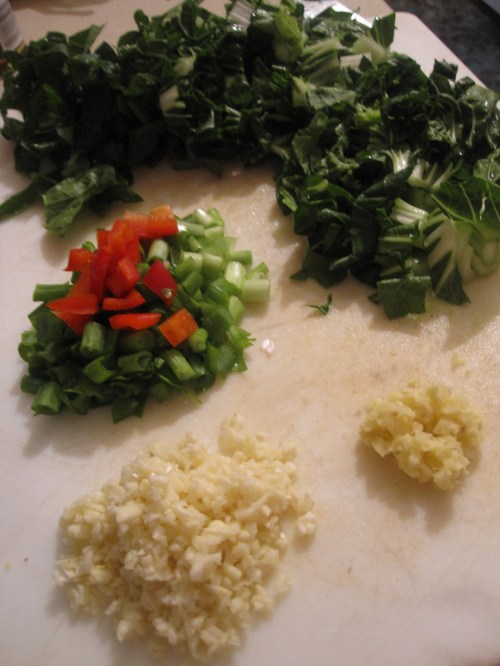 While the shrimp were marinating I chopped the garlic, ginger, scallions, red pepper (which had gone bad unfortunately), and bok choy.