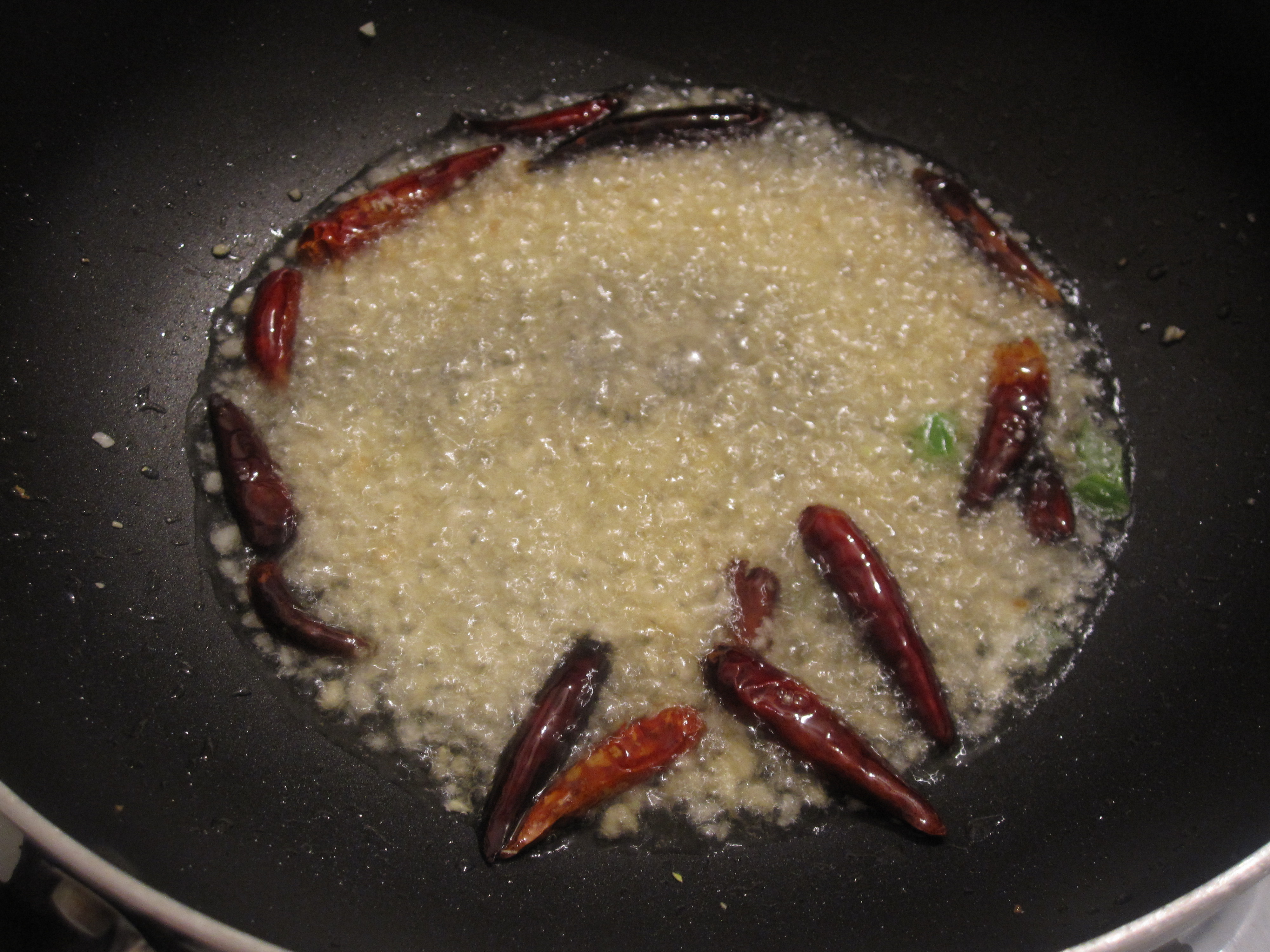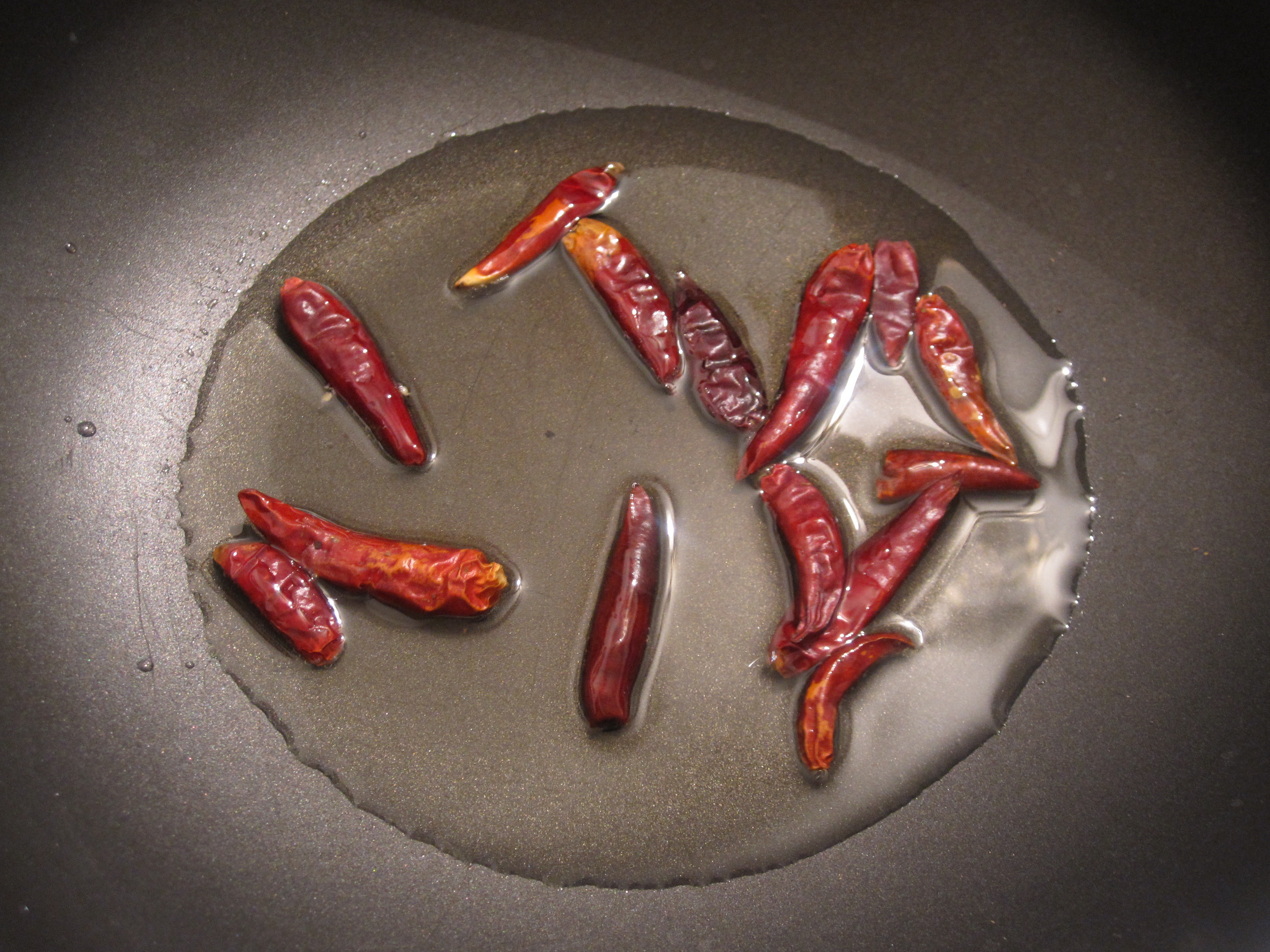 After the shrimp have marinated for half an hour it is time to start cooking. Heat peanut oil in a pan (we only had vegetable on hand) and heat up the chilis until they start to darken.