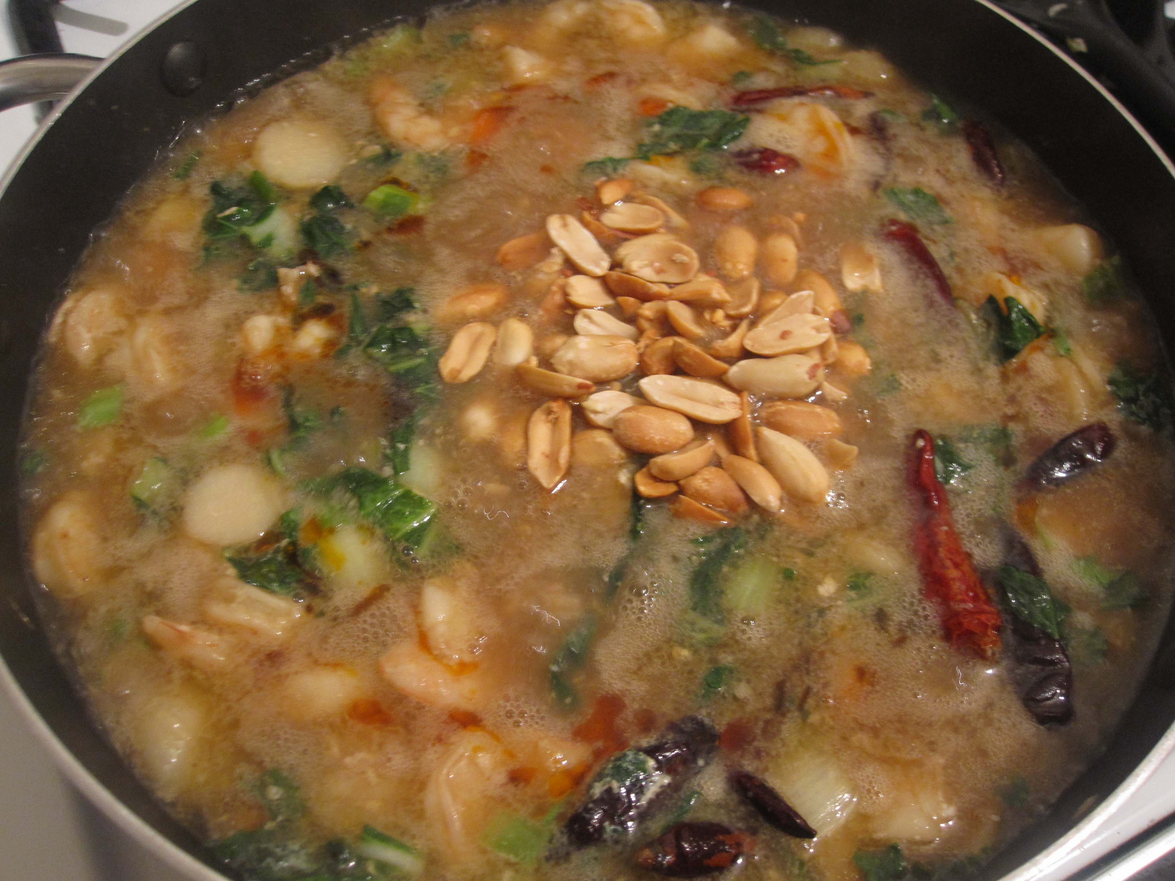 Add cornstarch and let it thicken up a bit. Then add the peanuts and some chili oil if you like it spicy.