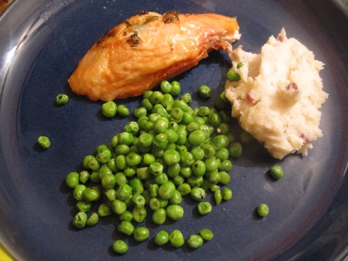 Sides of mashed potaters and peas made this a classic and delicious dinner!