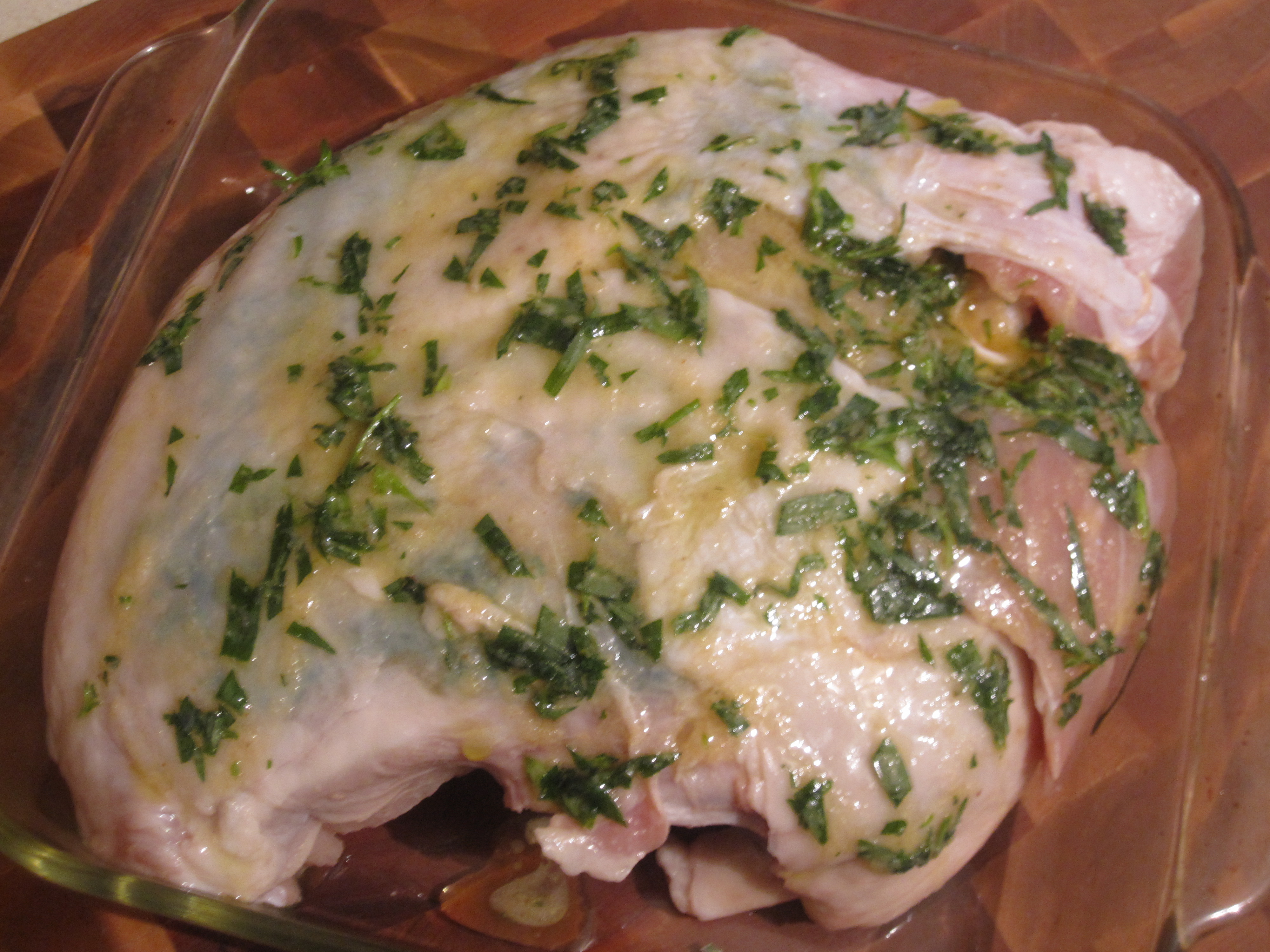 I mixed oil, lemon juice, salt, pepper and tarragon and spread it under the skin and all over the outside. Roasted for a while and sliced it up. It ended up being a good size for the two of us and even some lunches.
