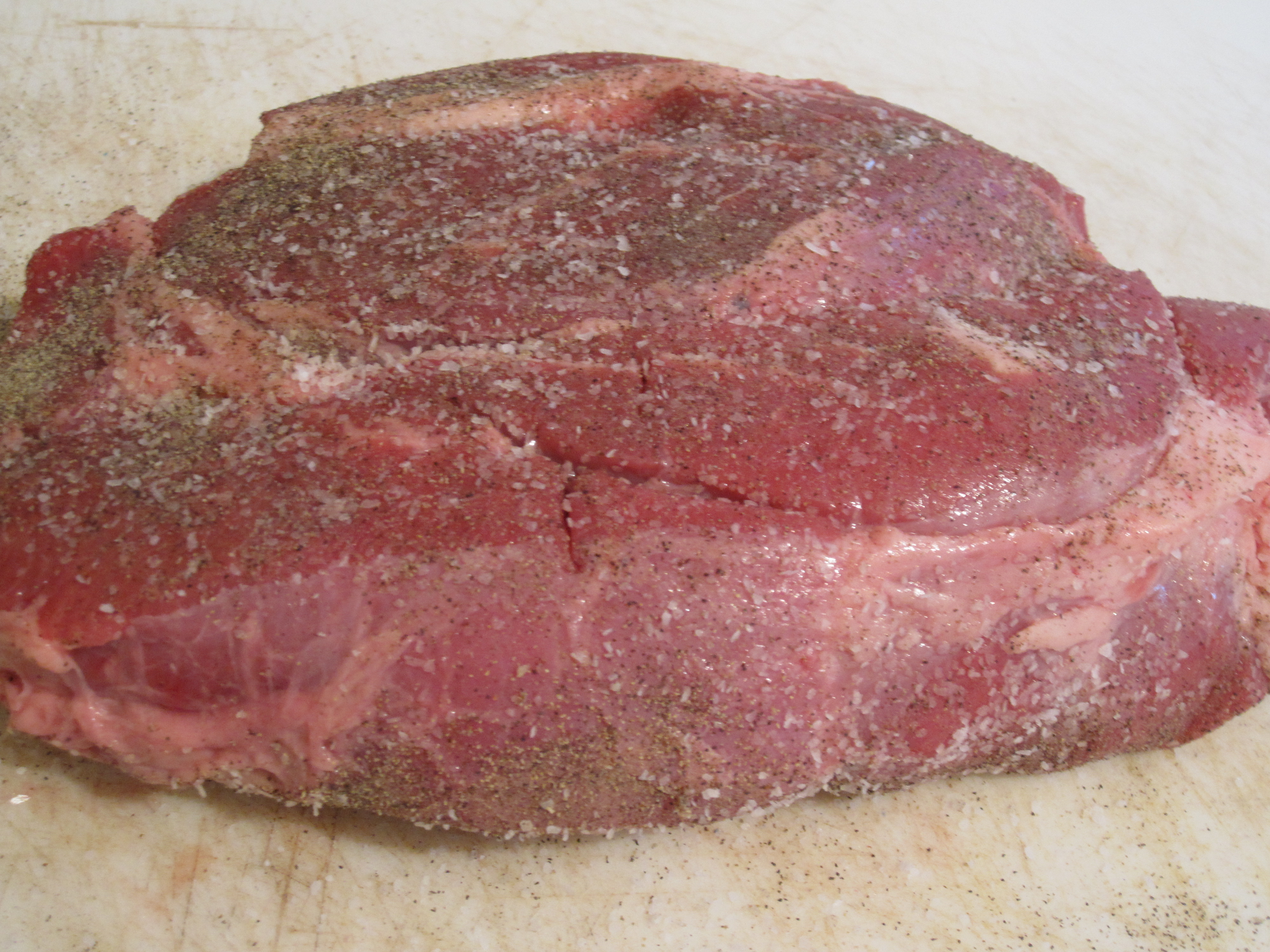 This was a great way to sort of stretch a thriftier cut of meat into a great meal. Started with about a 3lb cut of chuck and salted and peppered it.
