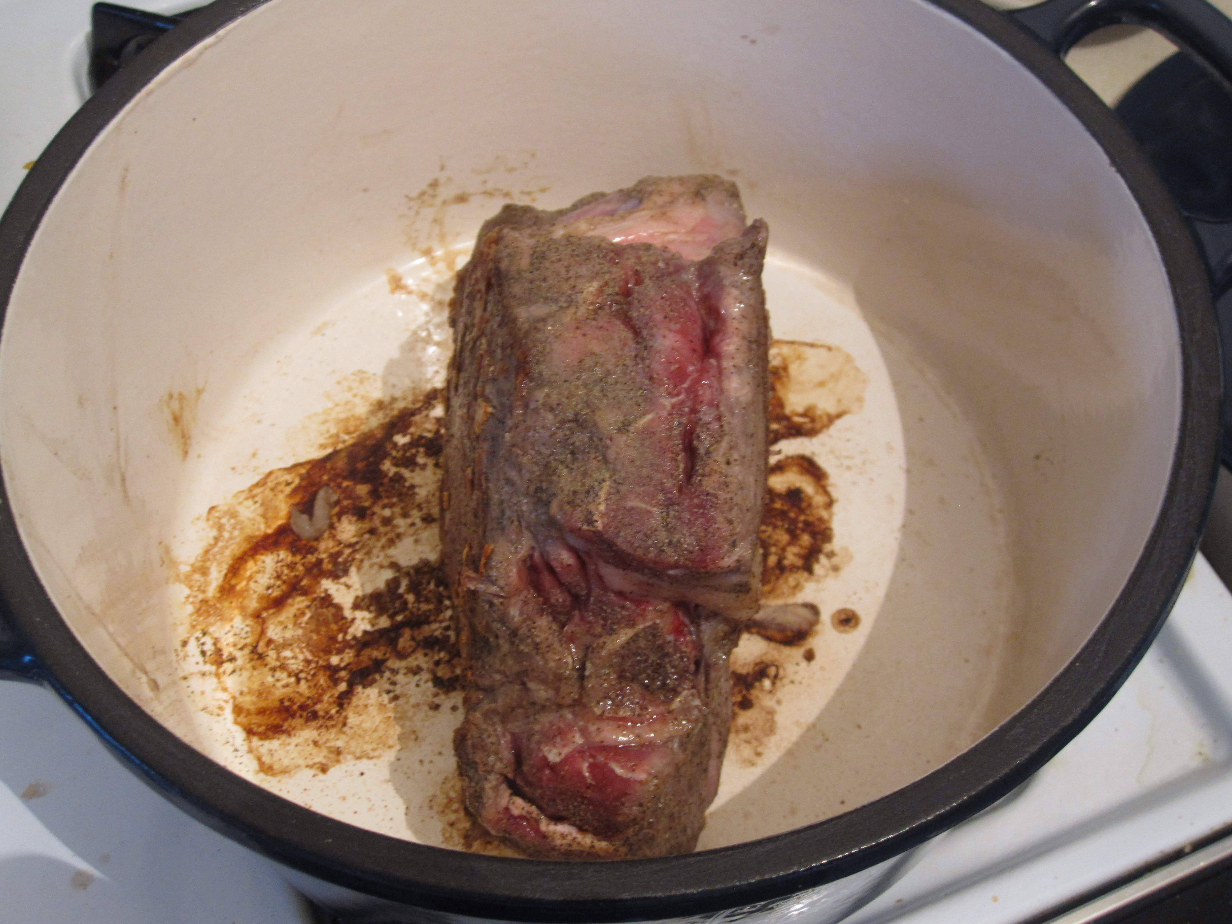 This was a dutch oven recipe from start to finish. The first step was to brown the meat on all sides in the pot on the stove top.