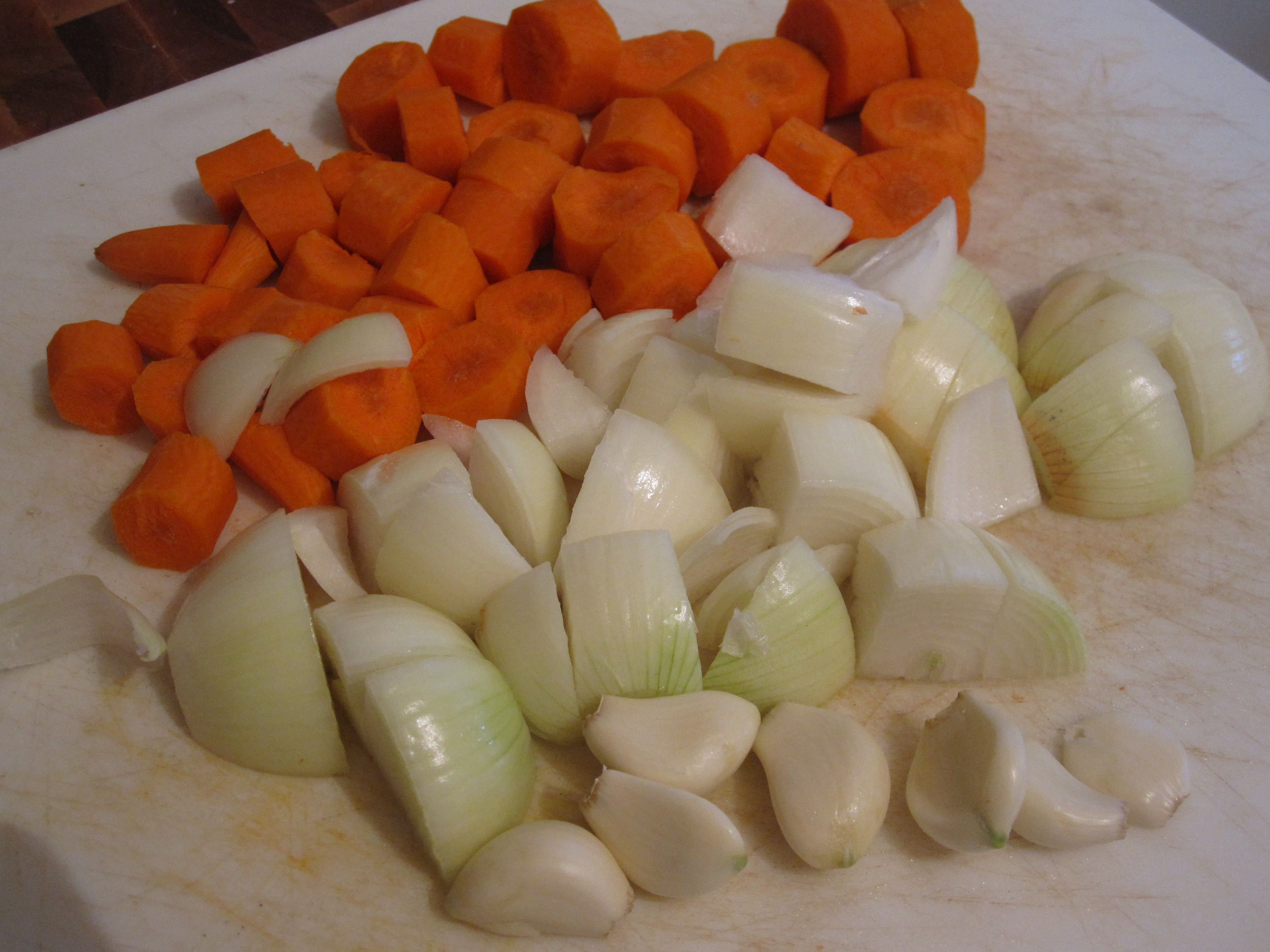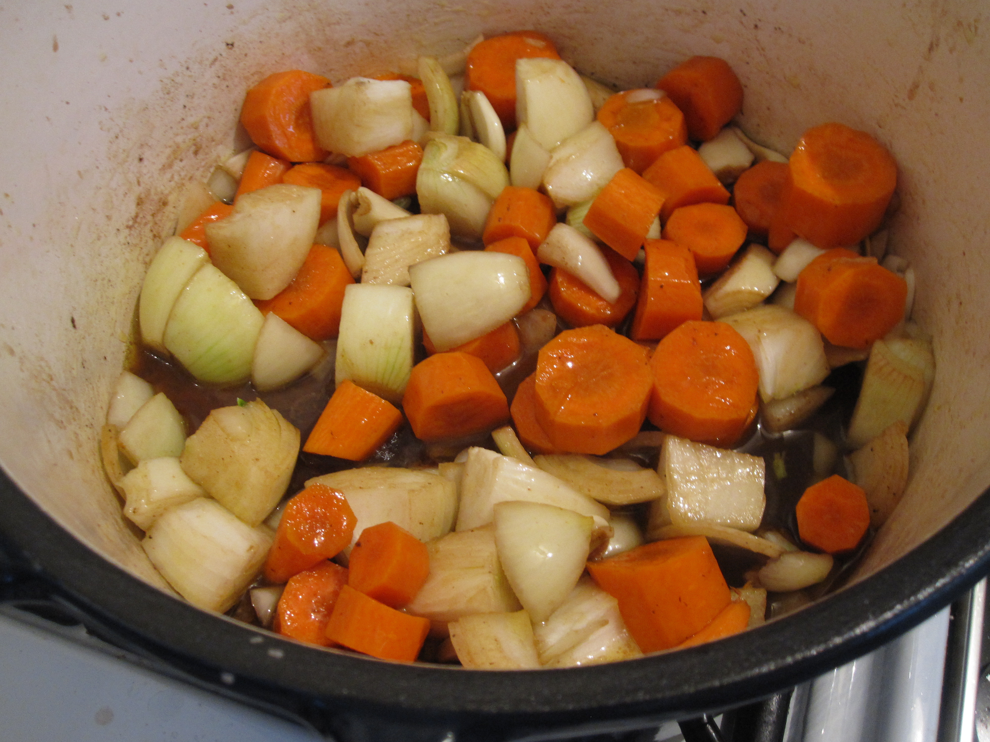 Make sure you turn it to brown even on the sides. It should be thick enough to stand on the edge…sometimes with a bit of help. Just get a good sear on all sides, about 5 minutes on each side. Once done, remove the meat and keep the flame going on the pot. While it was browning I cut the vegetables, this time garlic, onion, and carrot. Most people would include celery, but I think celery is the devil and never include it.