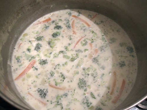 After this simmers for 20 minutes, add the broccoli and carrots and let those cook in the simmering soup for another 20 minutes.