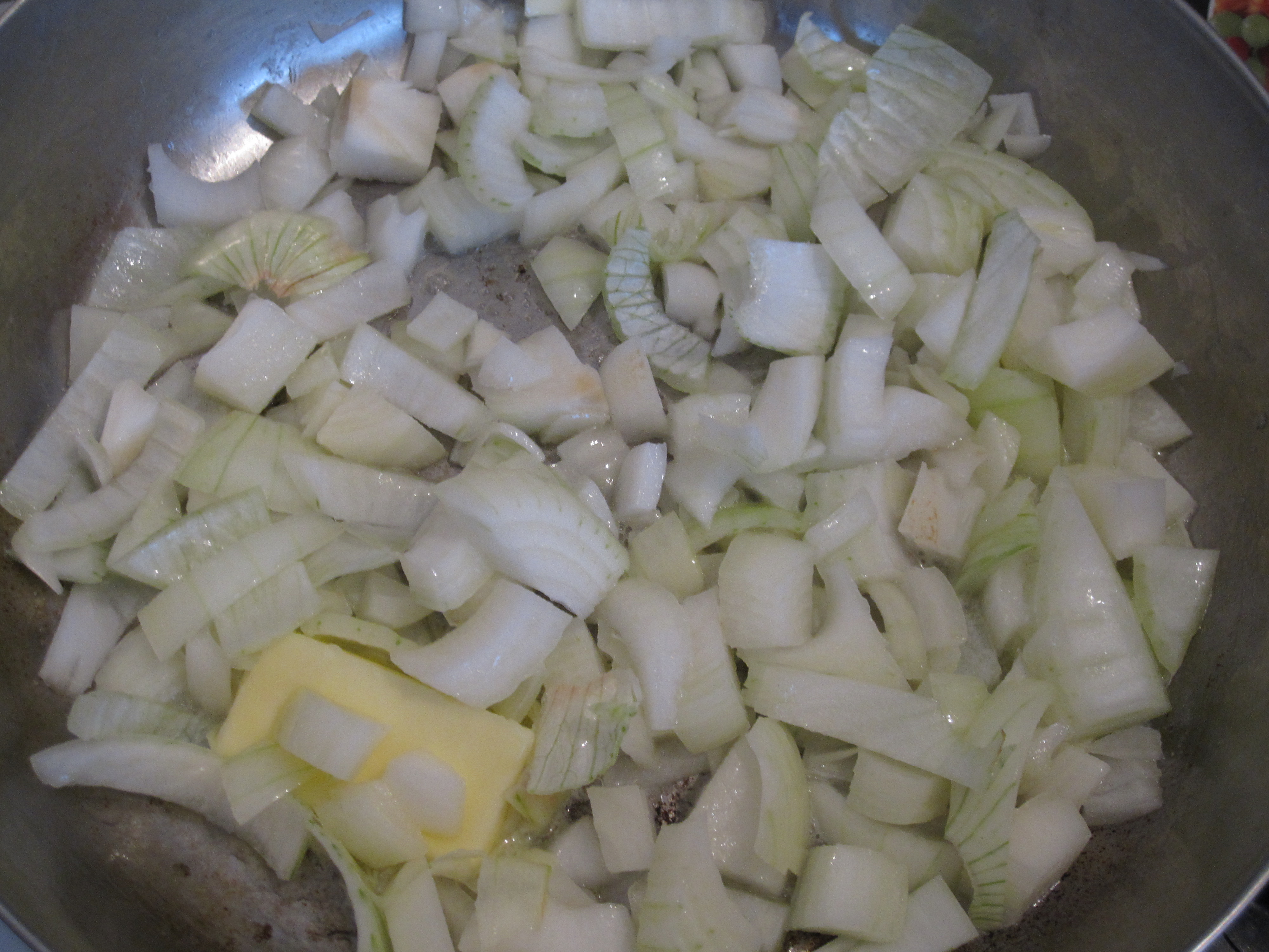 Put the dough aside for now.  There is plenty more to do.  Next onto the topping which is pronounced svatky, but I was not able to find an official spelling of.  I found out that Svatky is a city in the Ukraine, which is the general region where these are from and makes sense.  These recipes have been passed through the oral tradition and have been translated from various regions so it is easier to say than to write.  Svatky, or however it is spelled is onion carmelized in butter with bacon, which is universally delicious.