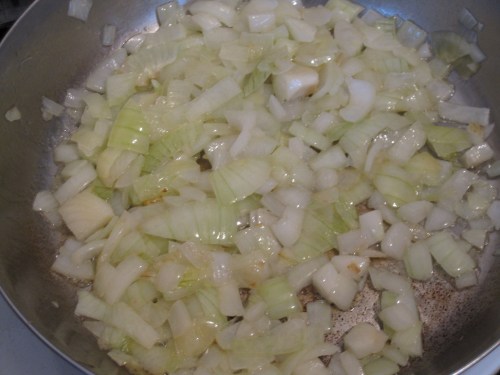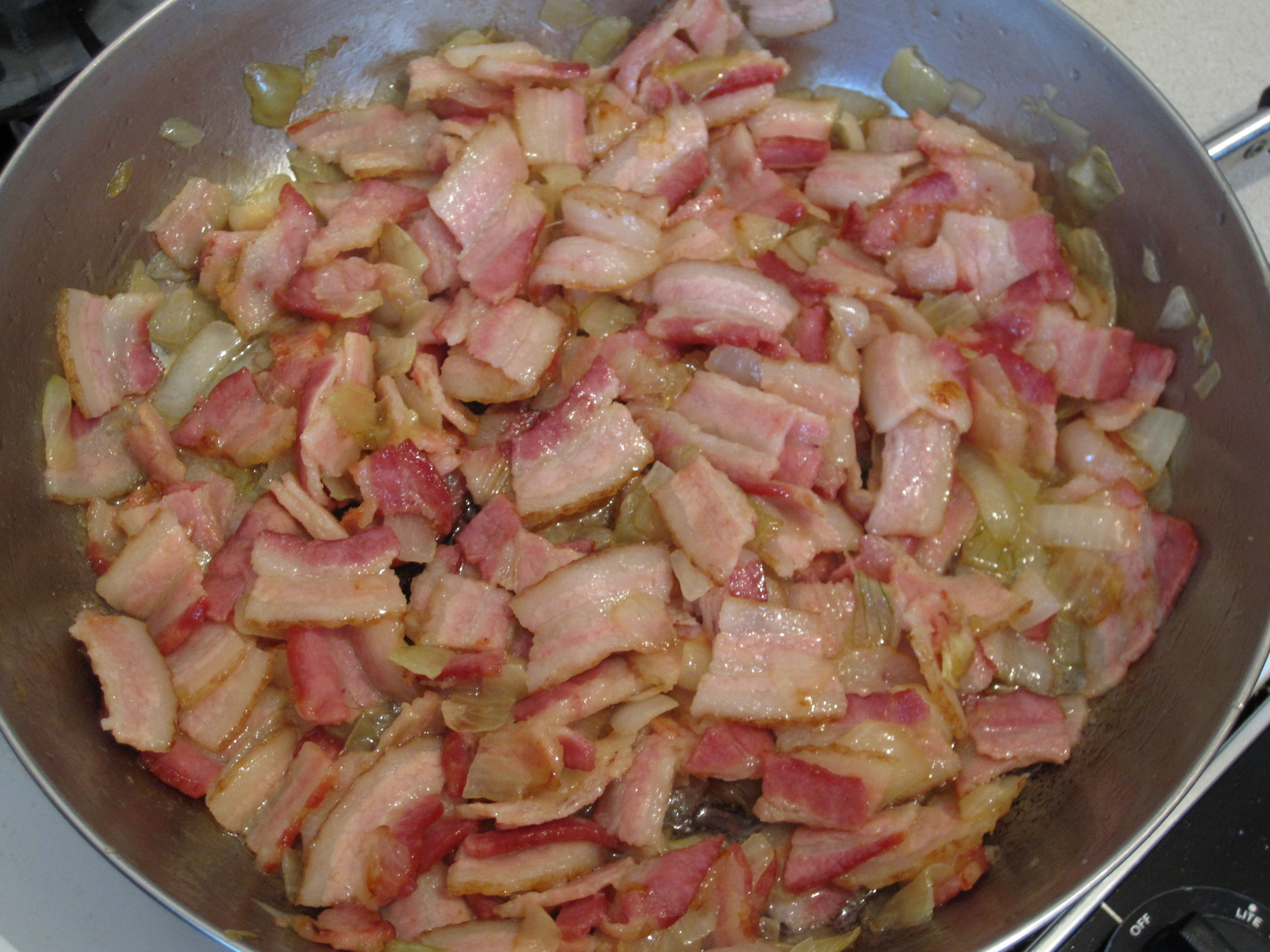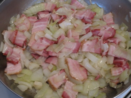 Once the onions start to brown and become translucent, add the bacon.  Cook until the bacon is almost done.  It will cook again during the final preparation and is best to be underdone instead of over cooked.
