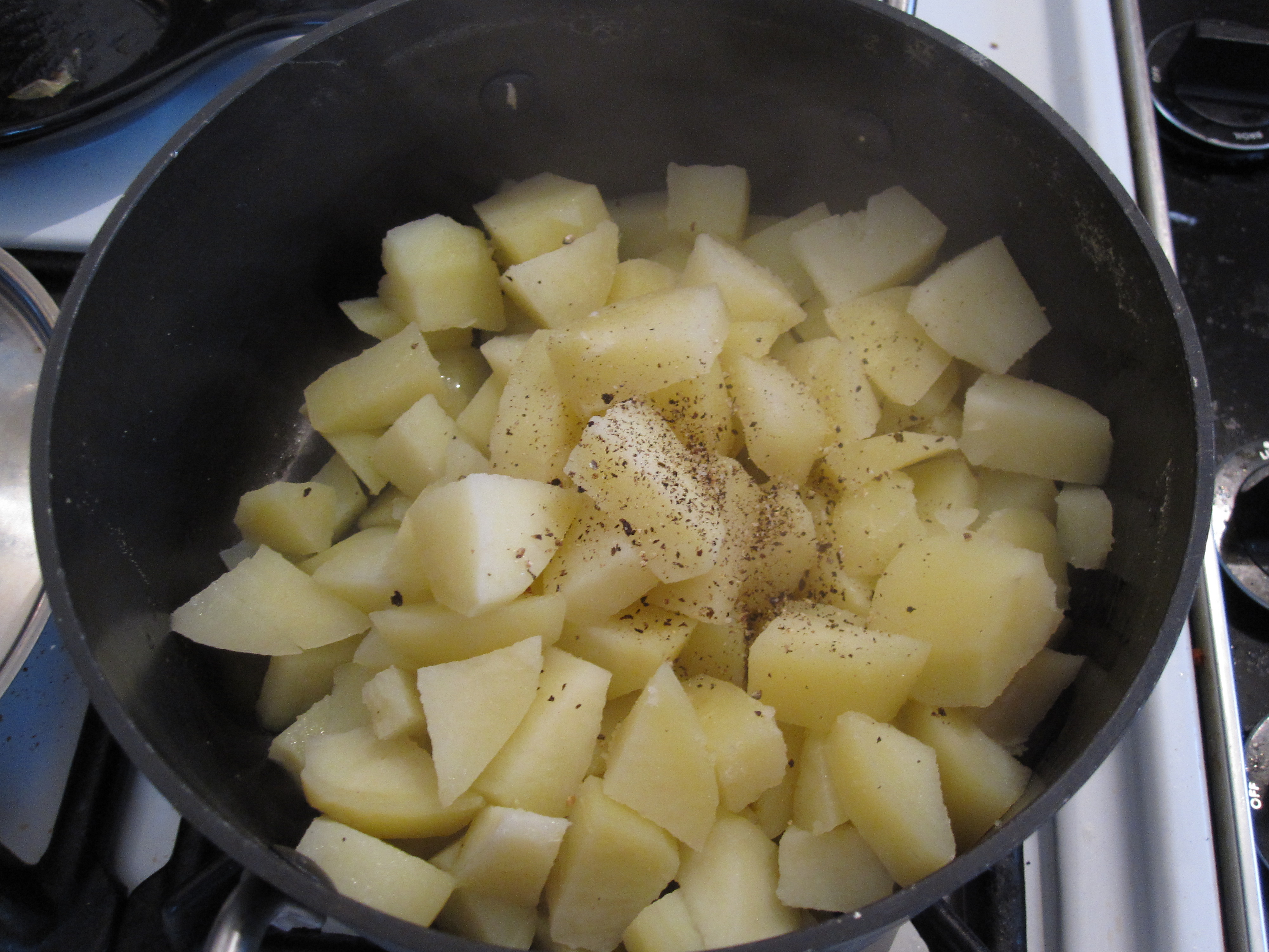 This is after the potatoes have been cooked and are about to be mashed.  We added a few spoonfuls of the grease and a few spoonfuls of the svatky mixture itself with a dash of salt and pepper.  This is definitely a dish that is better undersalted as the bacon and butter are pretty salty.  Remember it can always be added but can’t be taken back.  I usually add salt and pepper once they are on the plate and ready to be eaten.