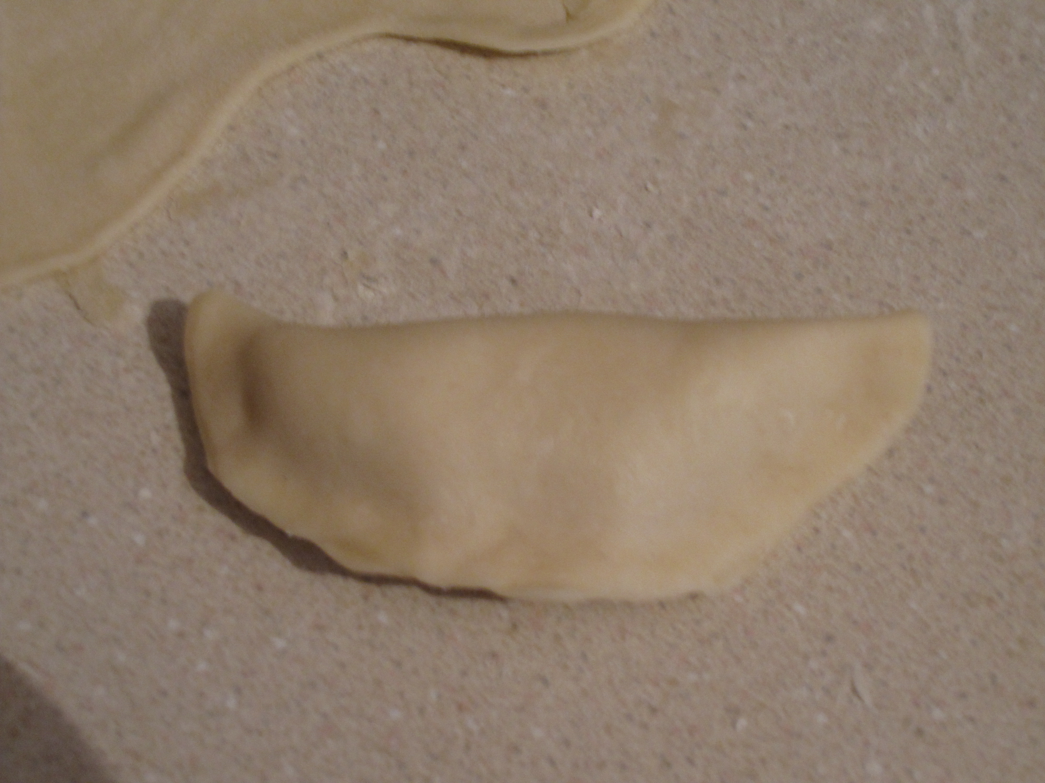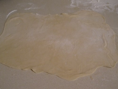 Now all of the parts are ready and its time for the assembly.  This is very similar to dumplings that we have made in the past.  Back to the dough.  Take about a third of the dough and roll it out onto the counter to a thin sheet.  It is hard to describe how thin it should be, but probably about 1/8 of an inch.  Remember that you have to be able to work with the dough pretty easily so roll it out with that in mind.