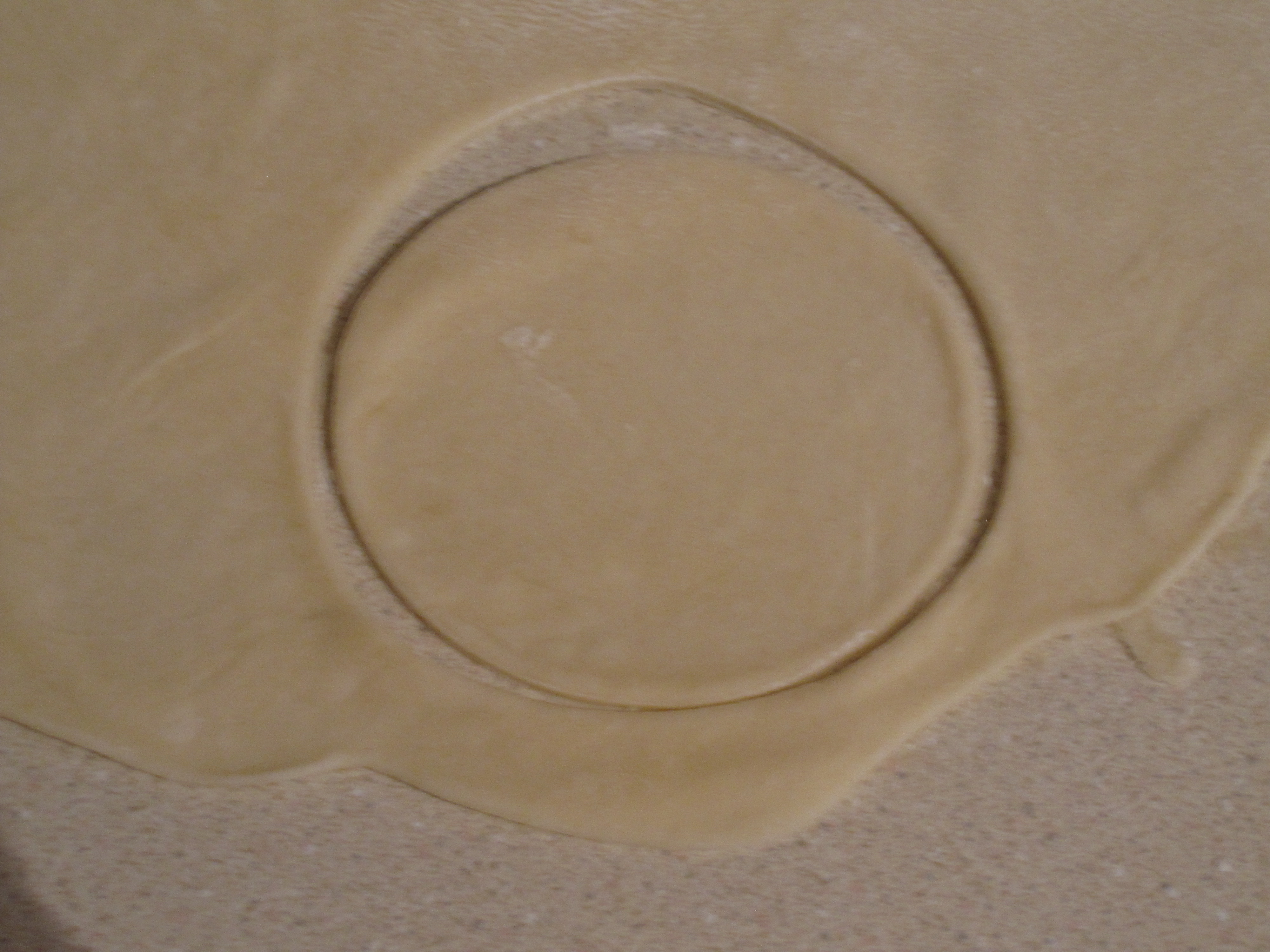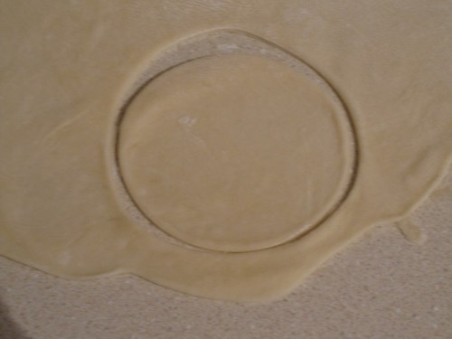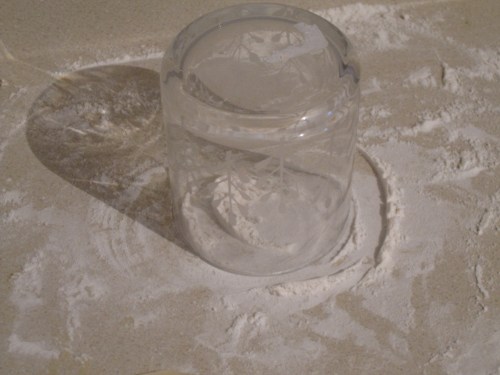 Use a few sprinkles of flour when working with the dough to keep it from sticking to the counter or roller.  Now it is time to cut out the wrappers.  What we did was just use a floured drinking glass as the mold.  Dip the glass edge in flour every few times and cut out as many wrappers as you can from the rolled dough.  Put the excess aside and combine all of the extras and roll them out again to maximize the wrappers you can get from the dough.