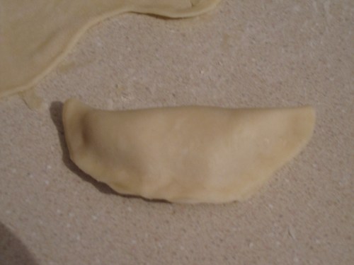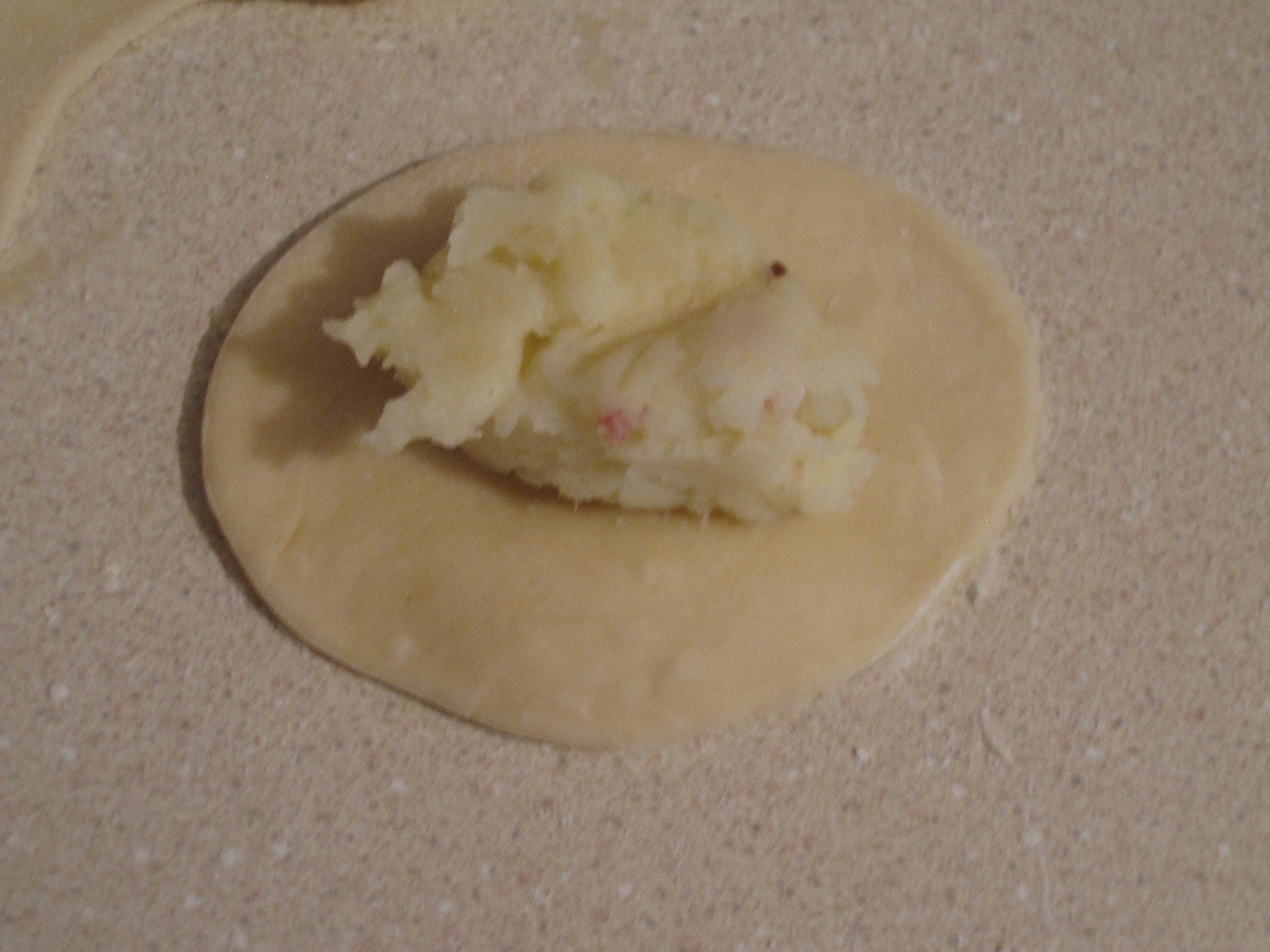 Take the wrappers and put a dab of the potato mixture in the middle.  As with dumplings, put as much as you can, but be careful not to put too much where the dumpling can’t close properly which is very important.