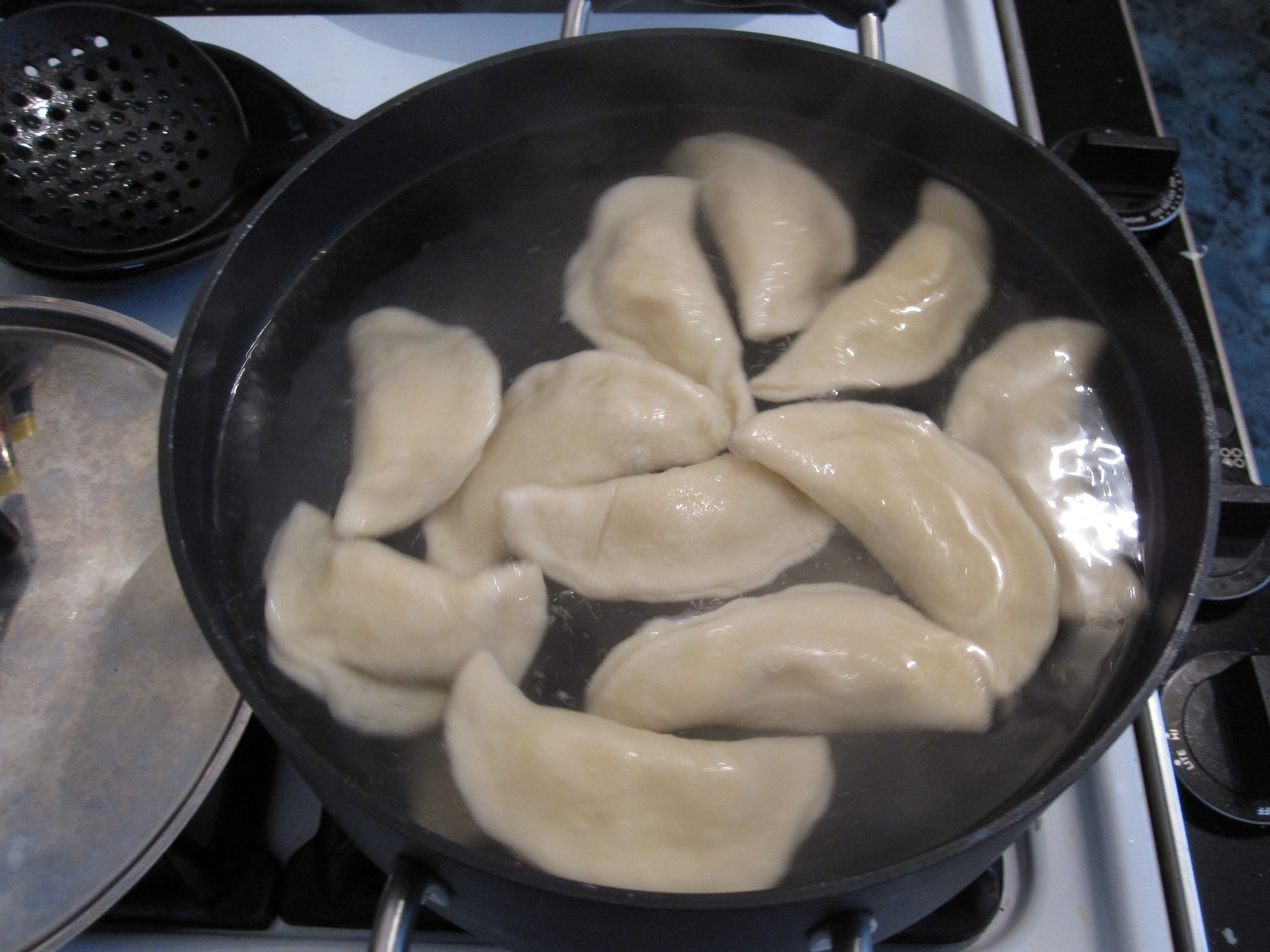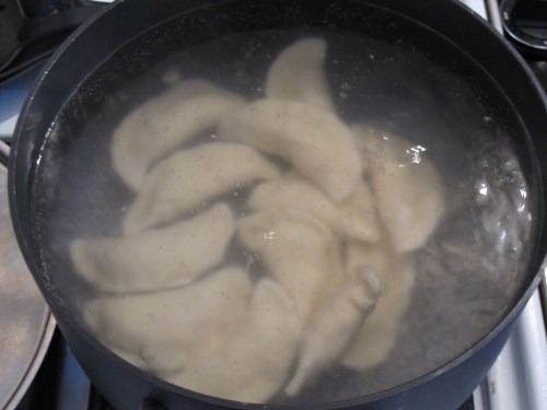 Once all of the pierogies are formed and sealed they need to be boiled.  Place some, not too many in boiling water and boil for 2-3 minutes after they have risen to the top.  This will be about a total of 5 minutes in the water.  Stir occasionally so they don’t stick to each other or the pot.