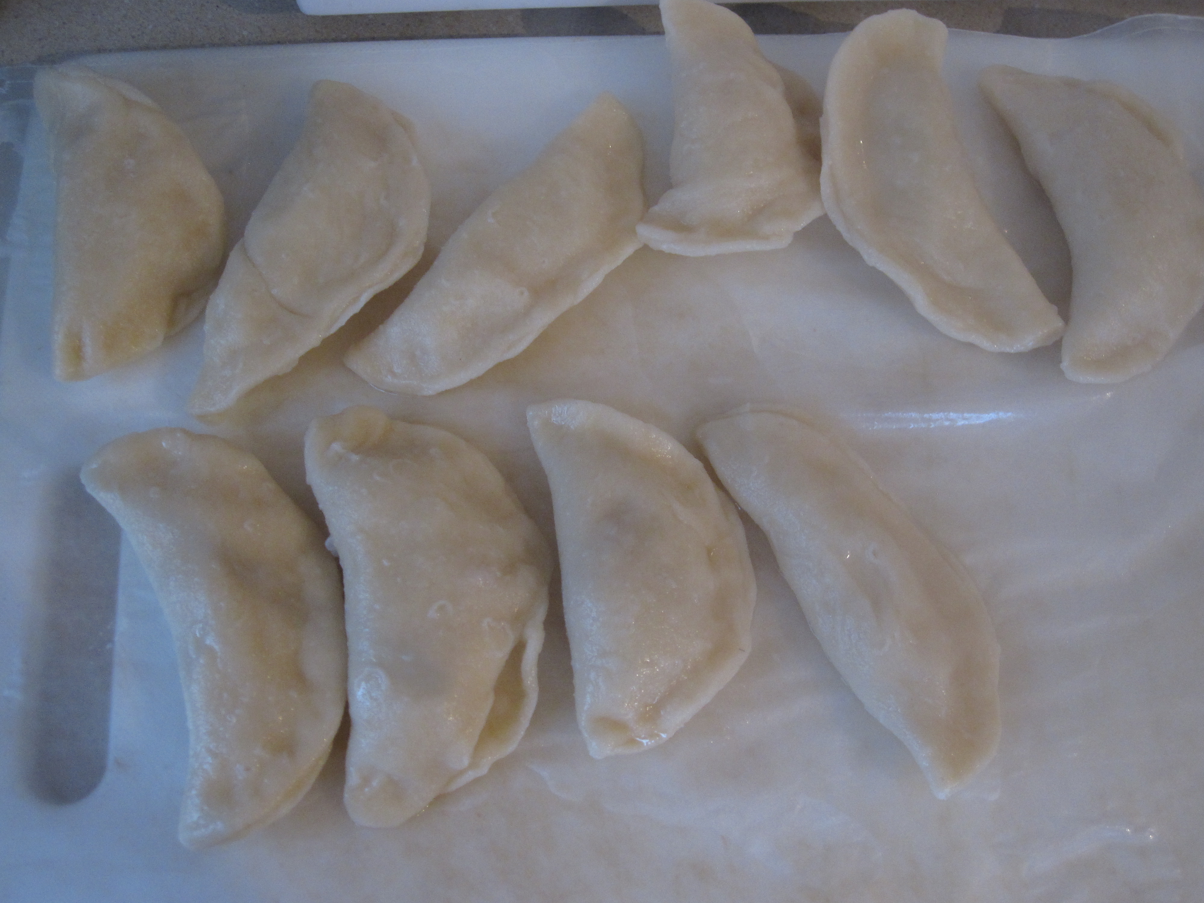 At this point, you can continue and cook them until they are ready to be eaten, or store them until they will be used.  Today we had to sample them of course and continued cooking about a dozen and stored the rest.  We will have some on Christmas day for lunch which is also part of the tradition.  There will most likely be some made Christmas late night too.  They can be refrigerated for about a week or so until needed.  To store them, put a paper towel in the bottom of a pan/container and be sure to put a piece of waxed paper between each layer of rogies or they will stick together.  Be careful of laying them too close together also as they are very sticky at this point.
