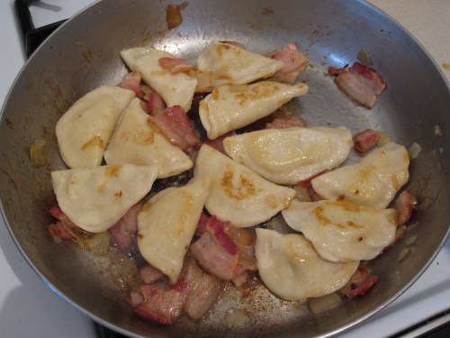 The final preparation step is to heat up some of the svatky mixture in a pan.  If there is not enough grease from the mixture, add a little butter so that pierogies will brown nicely.  Pan fry them for 5-10 minutes or until cooked to your liking.  We usually like them to be pretty crispy with some good browning.