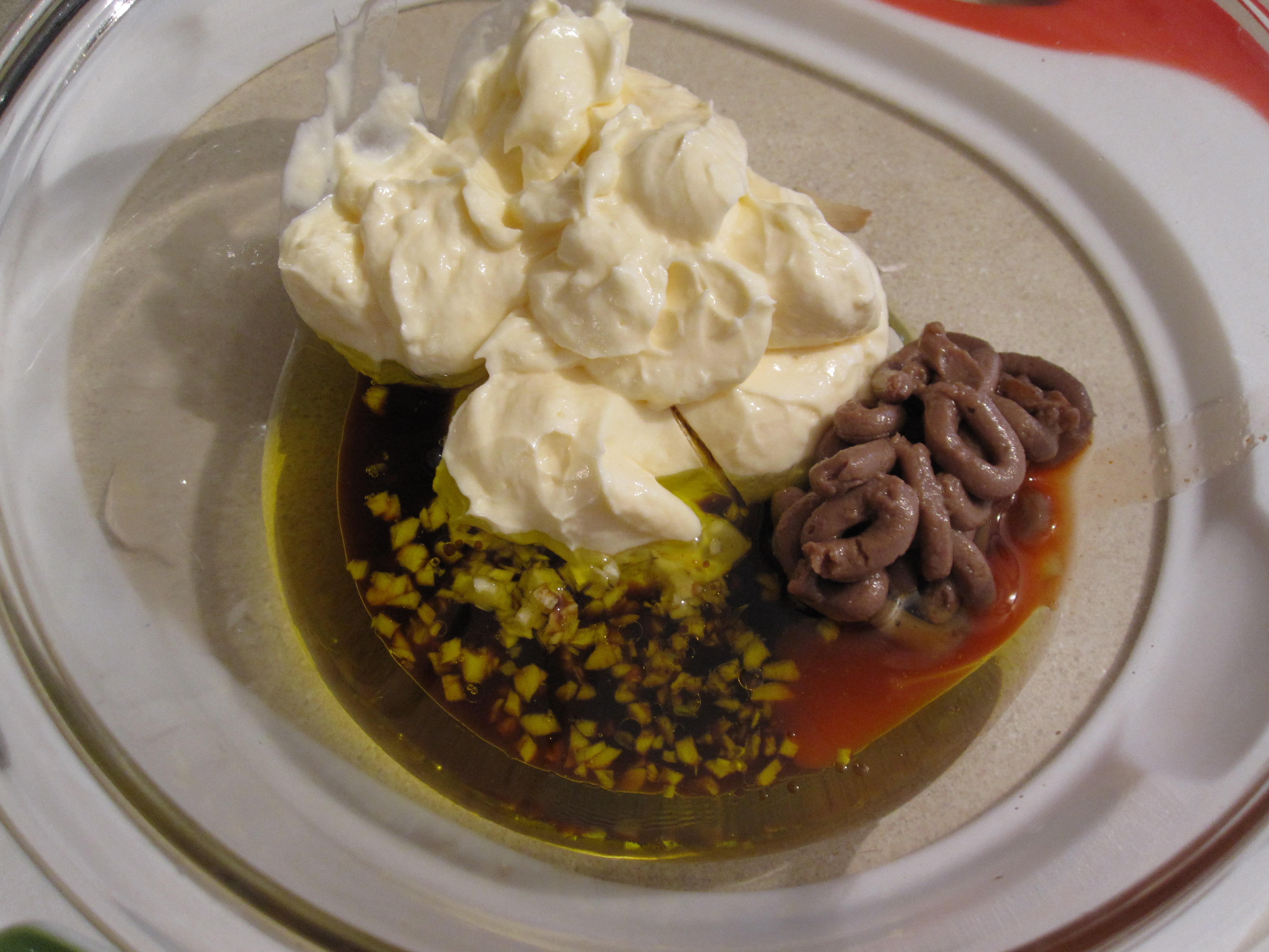 Then it’s pretty much just a matter of combining all of the ingredients in the dressing. Mayo, garlic, hot sauce, olive oil, etc.