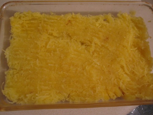In a rectangular baking sheet create a layer of spaghetti squash in the bottom of the pan. Pressing down with a fork to make it a solid layer.