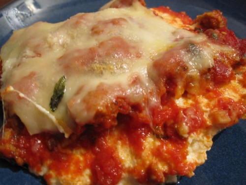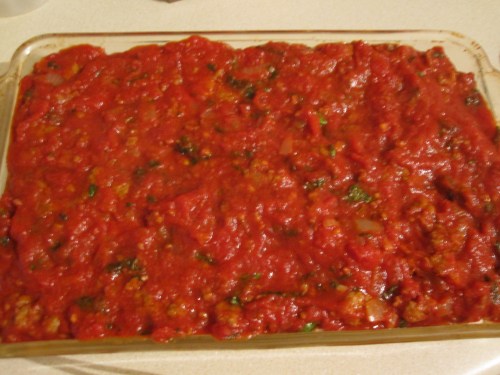 Delicious! Next time I’ll add red pepper flakes to the meat sauce (I used ground turkey instead of sausage; I couldn’t find the sausage I wanted), but this was just yummy.