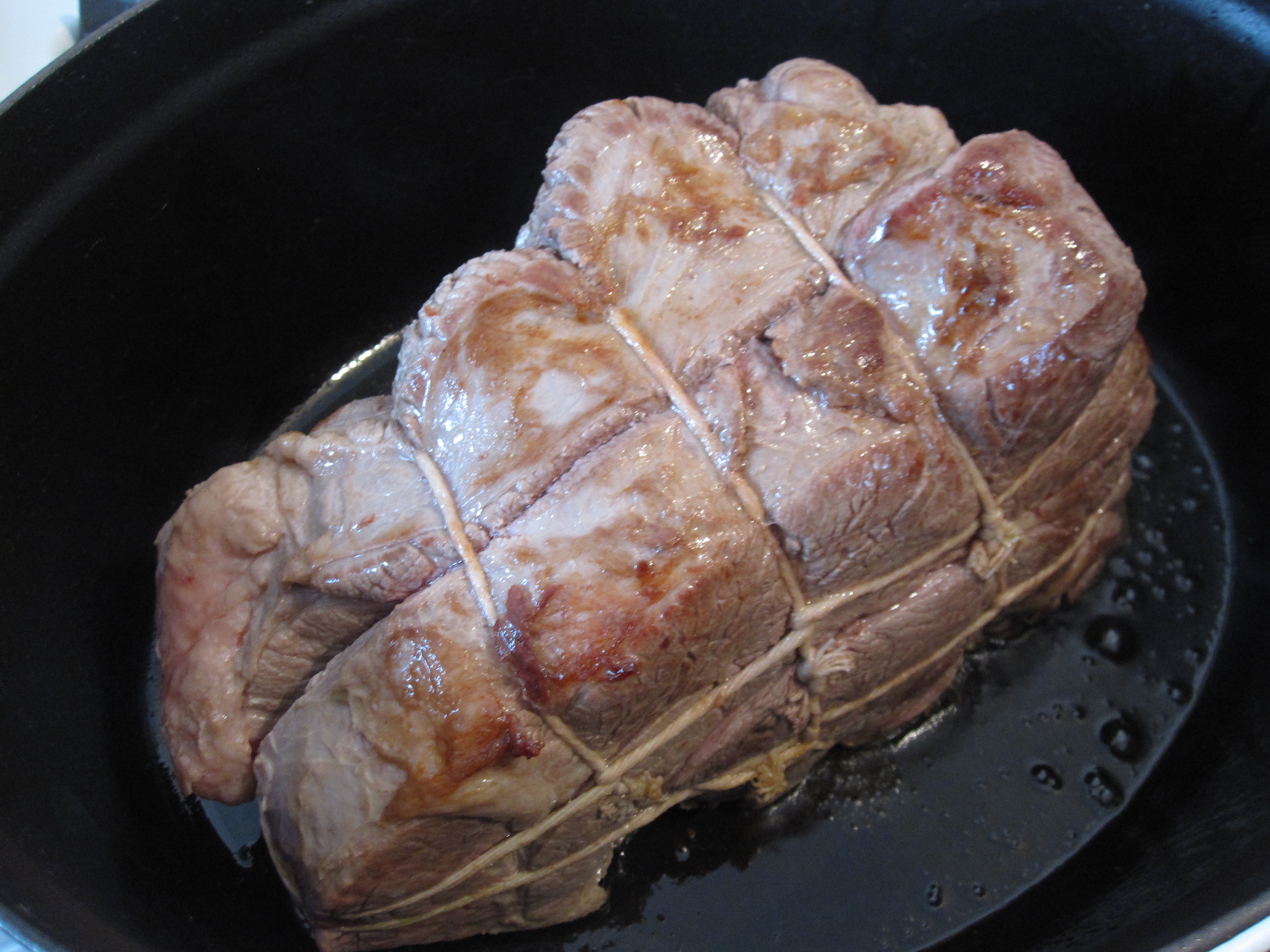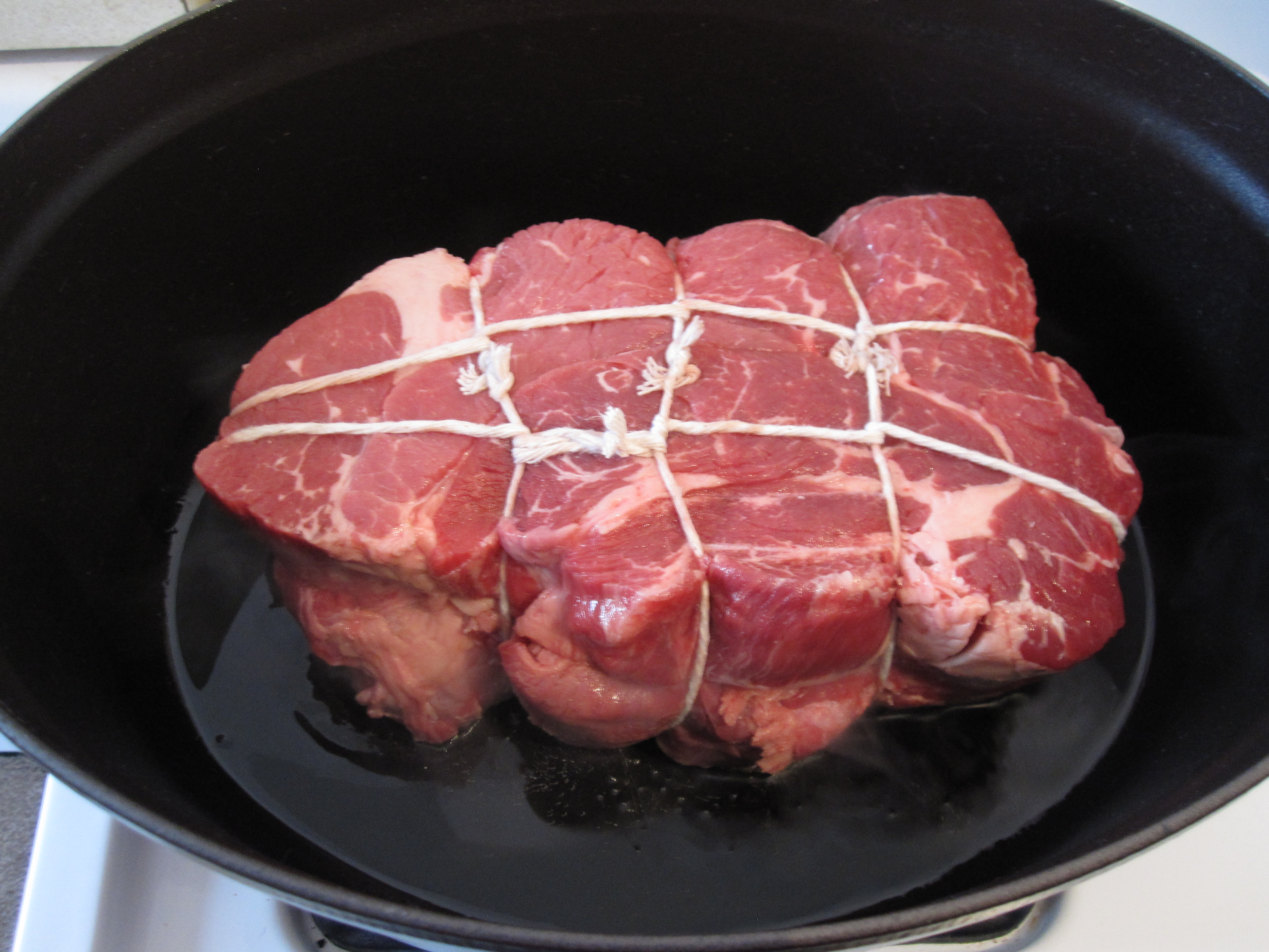 The first step is to brown the roast on all sides in hot oil.