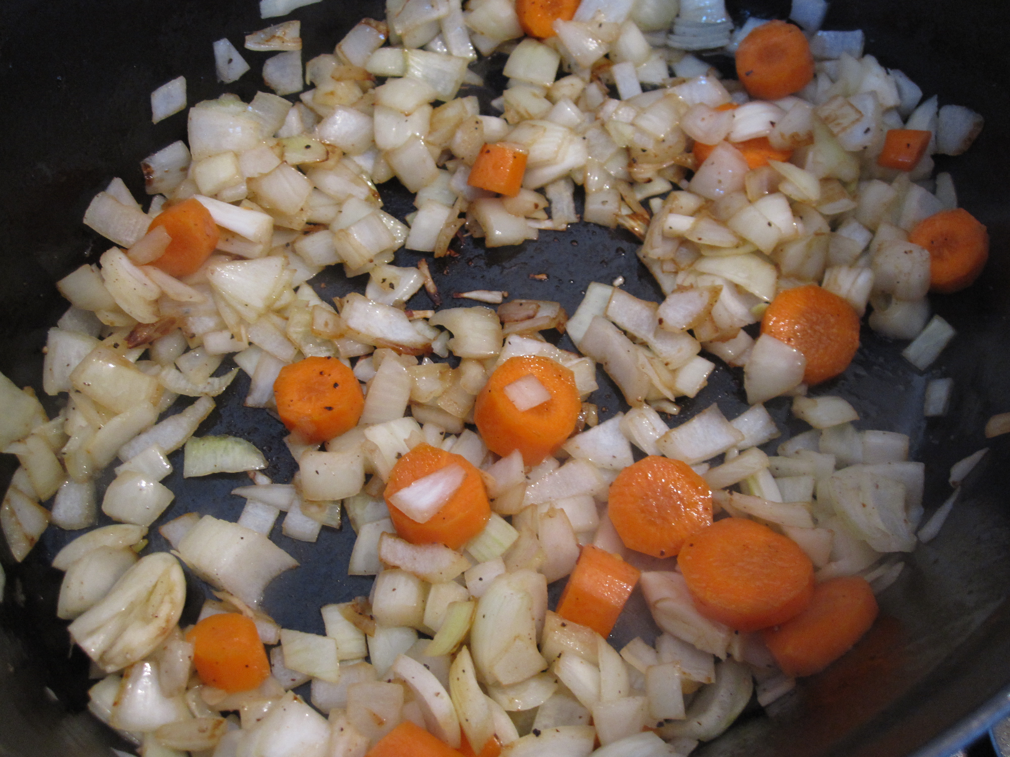 Next, add the garlic, onion and carrots to the pot. The recipe also calls for celery, but Greg is not a fan so we omitted it.