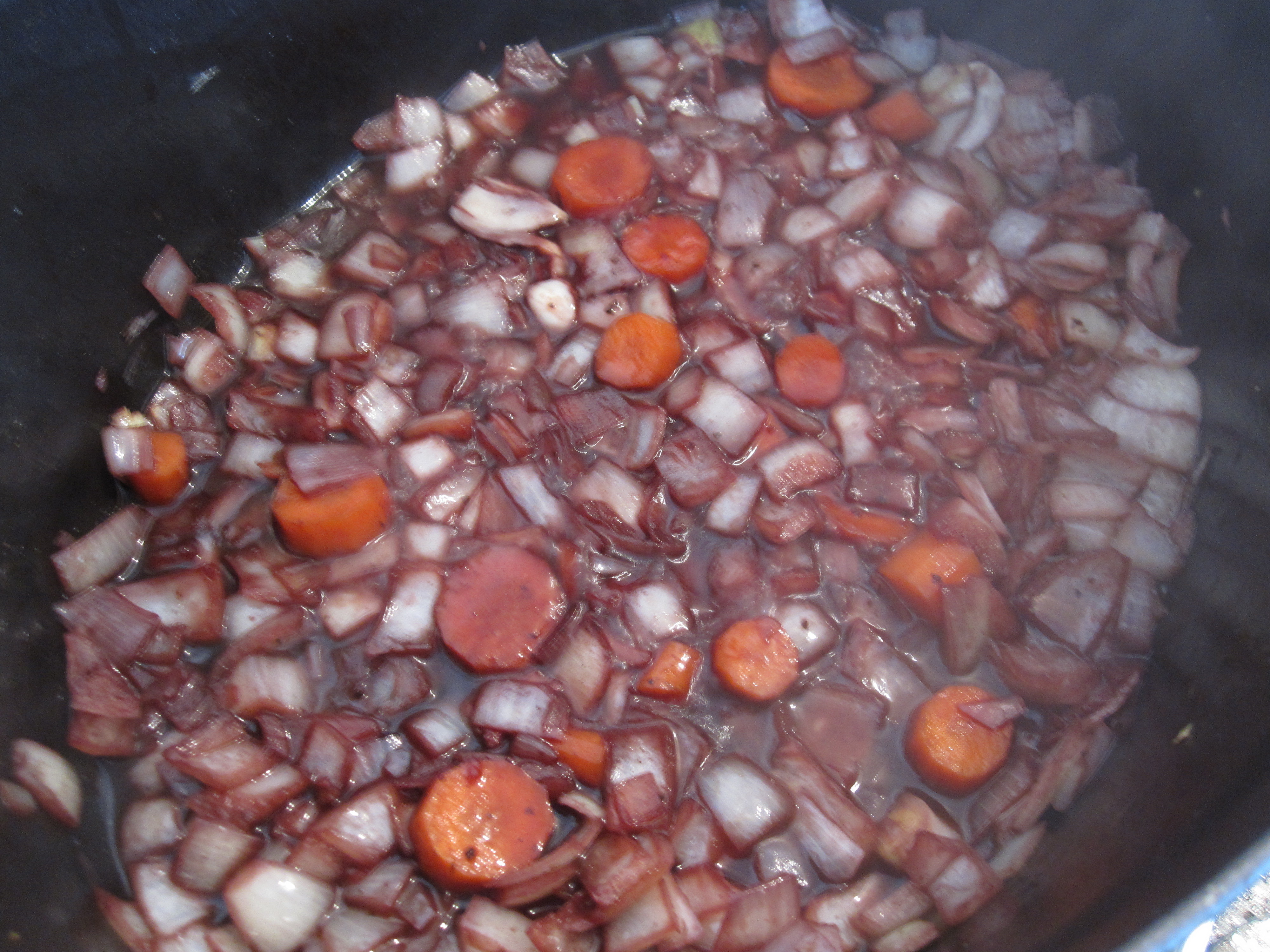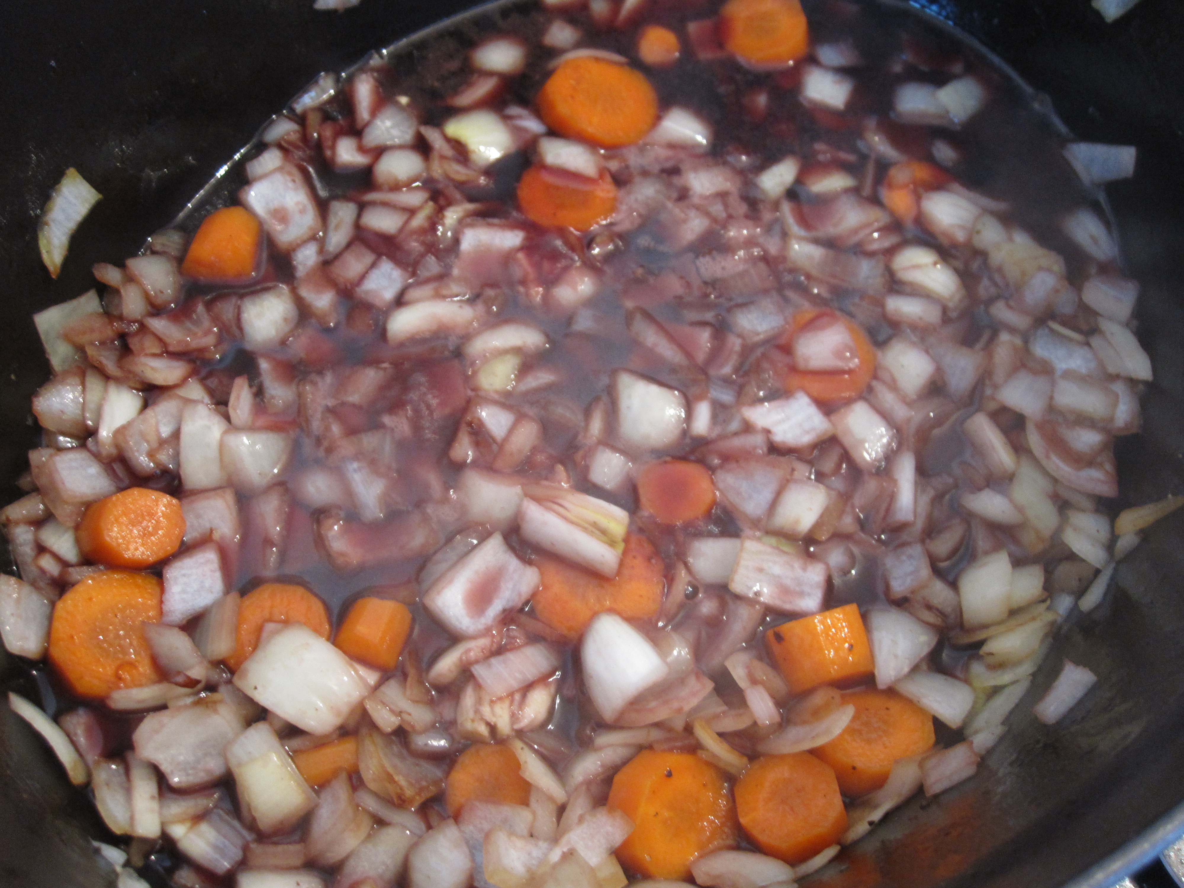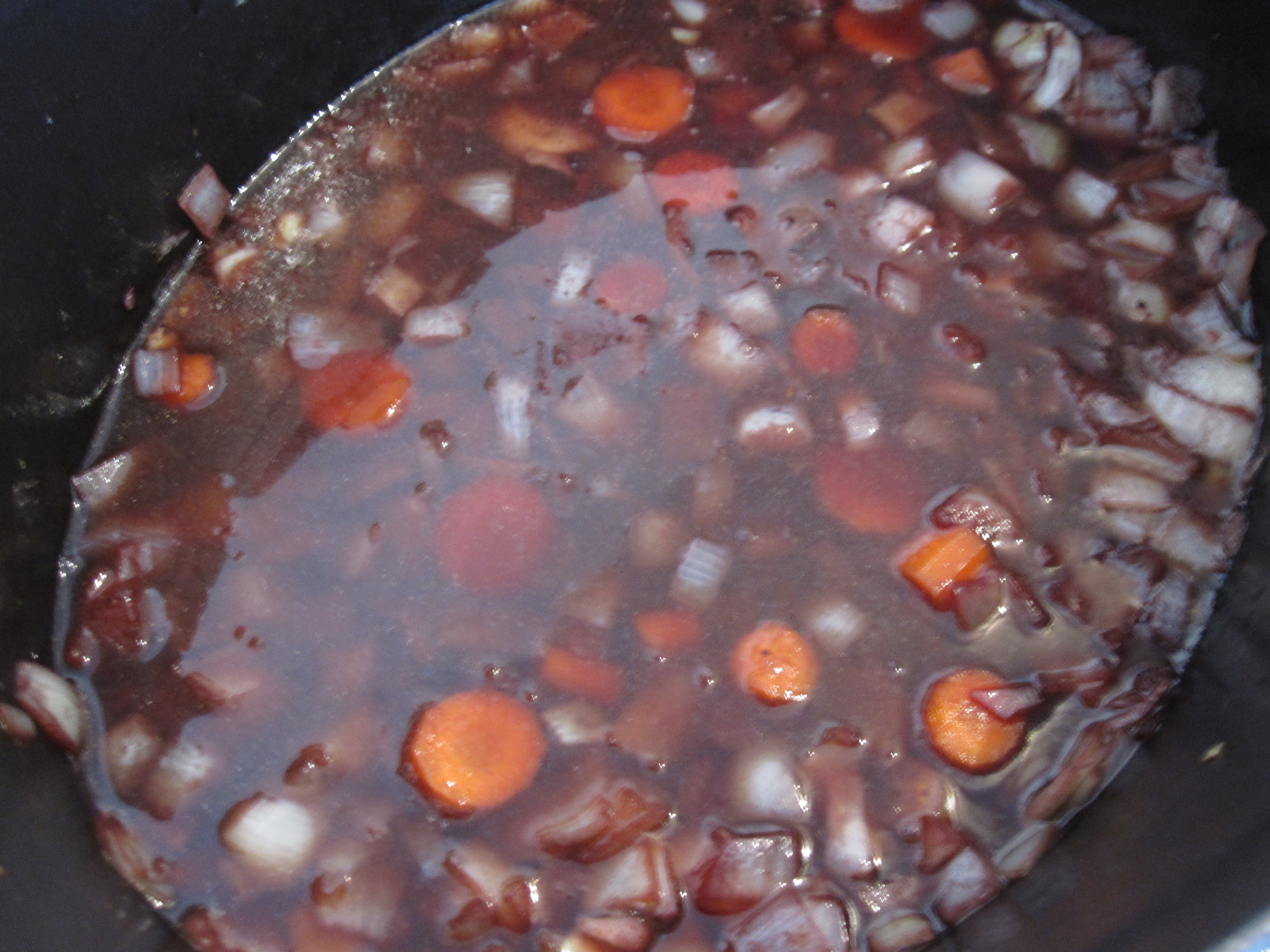 At this point, it’s time to add the braising liquid. Add the vino! The recipe obviously calls for a zinfandel. I didn’t have any on hand so I used a shiraz.