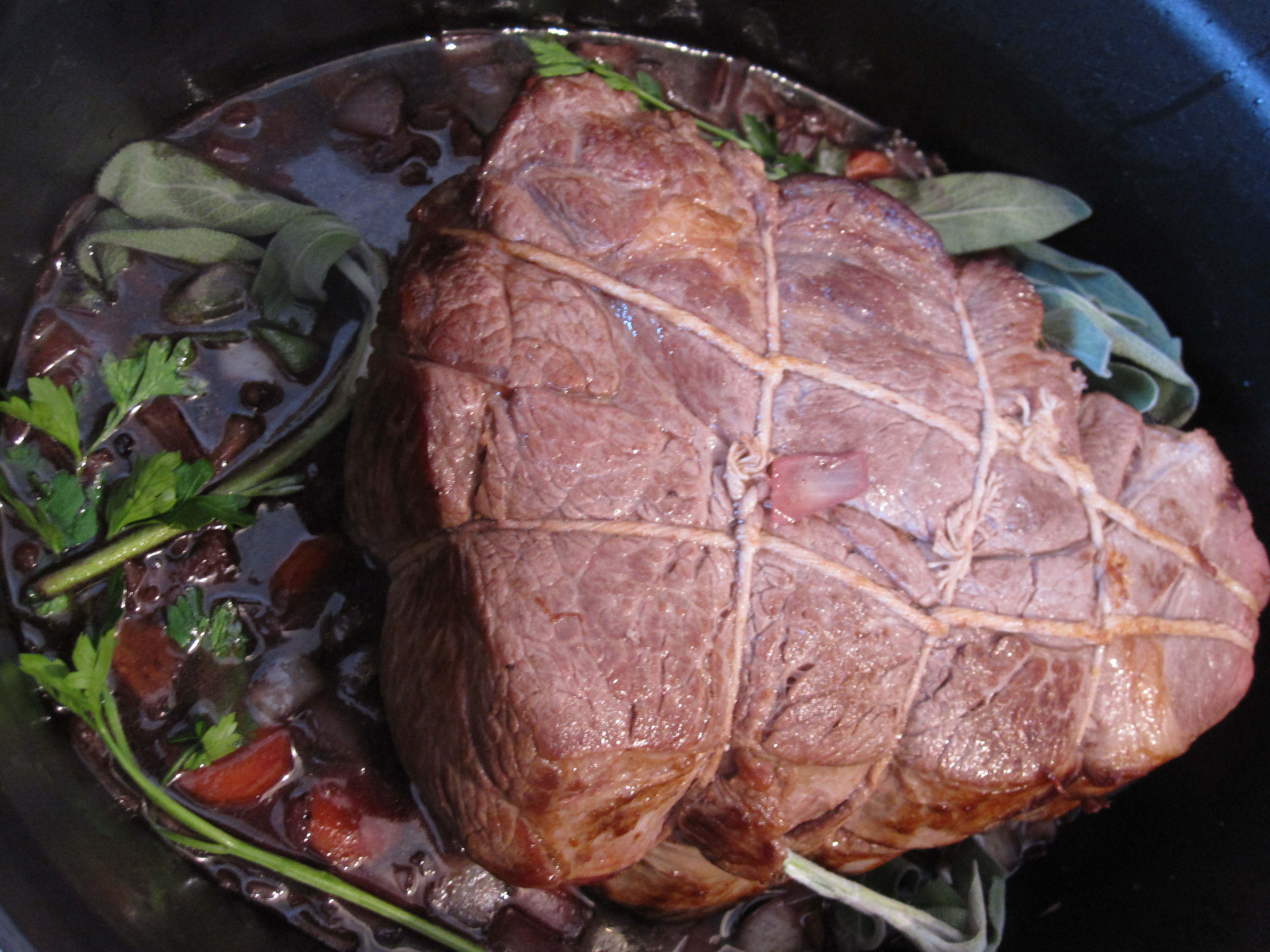 The first recipe I made was courtesy of the Molly Steven’s book: Zinfandel Pot Roast with Glazed Carrots & Fresh Sage. Not only was the recipe easy to follow but she also gives good advice on selecting the right cuts of meat, step by step instructions on how to tie it correctly, and even how to select good parsnips. I found the tips on meat selection to be especially helpful as I was sifting through the meat choices at the supermarket. She suggested some cuts and stressed the importance of not selecting others. It gets really confusing to me so that was really nice.