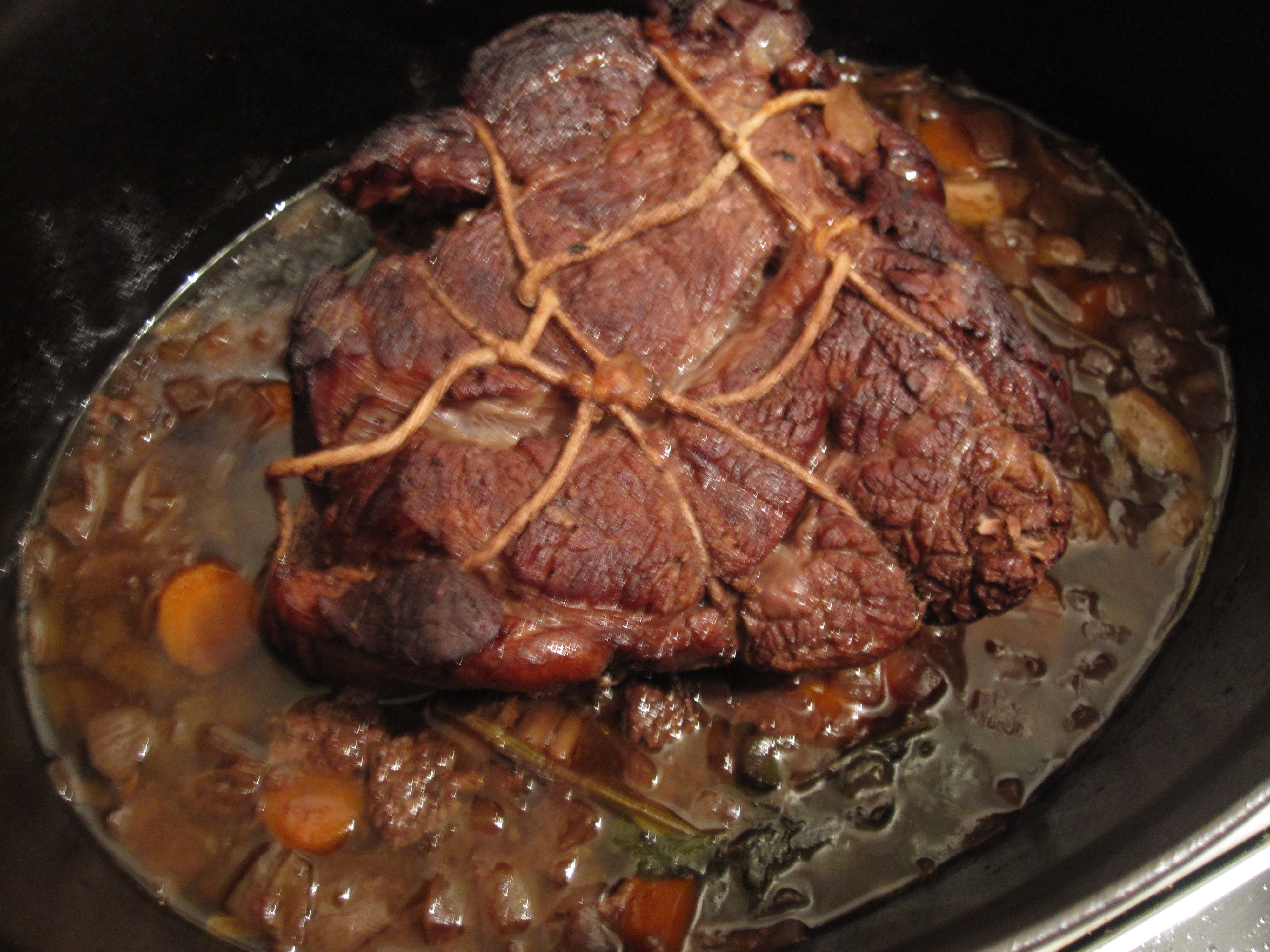 Lift the beef out and place on a carving platter. Strain the cooking liquid, pressing down on the solids to extract the juices. Pour the liquid into a saucepan and let it settle. Skim as much fat off as is possible. Measure out 1/2 cup of the juices for glazing the carrots.