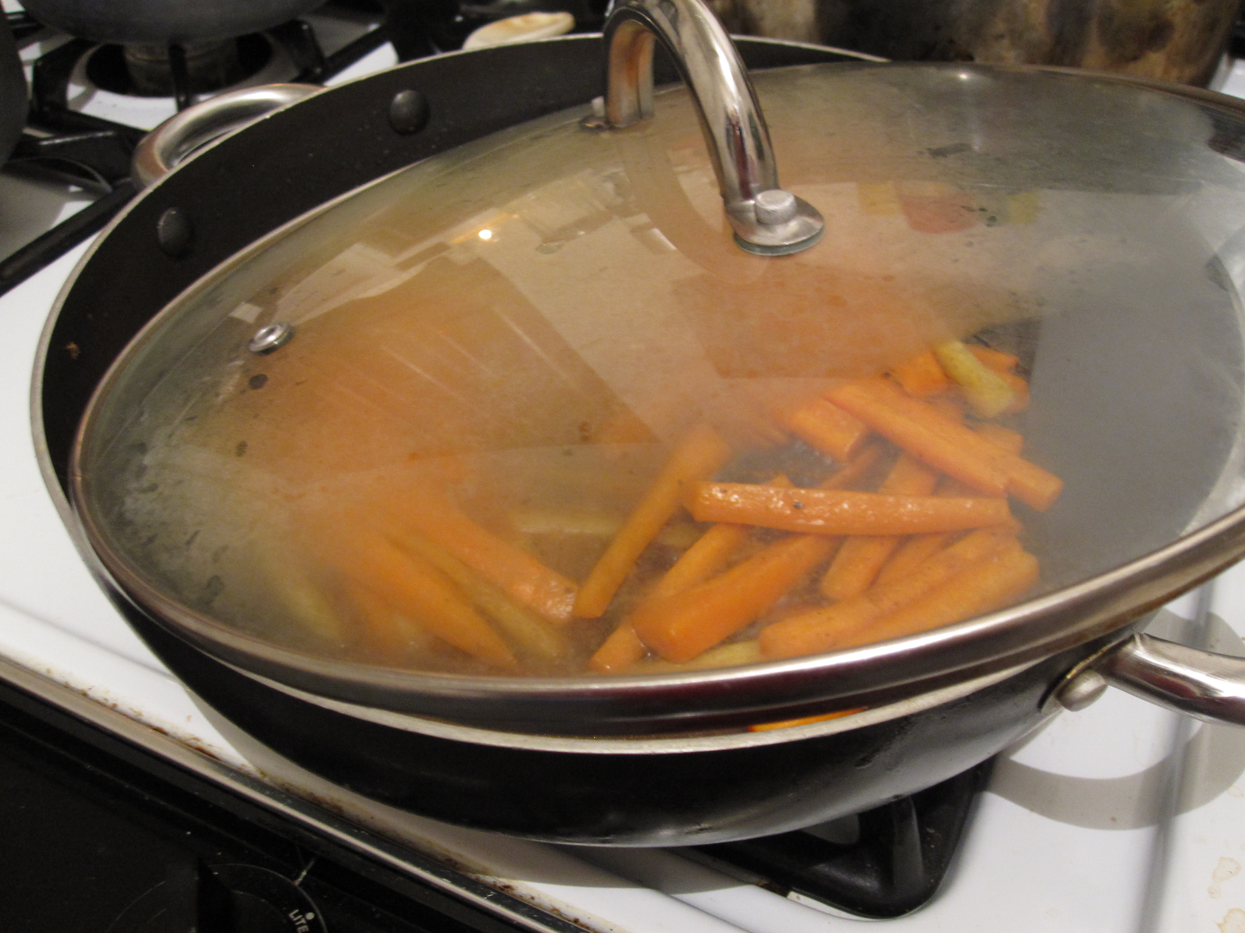 The final step is to reduce the leftover braising liquid to concentrate the flavors. Slice the meat and serve with the juices and glazed carrots. We also had mashed potatoes with this.