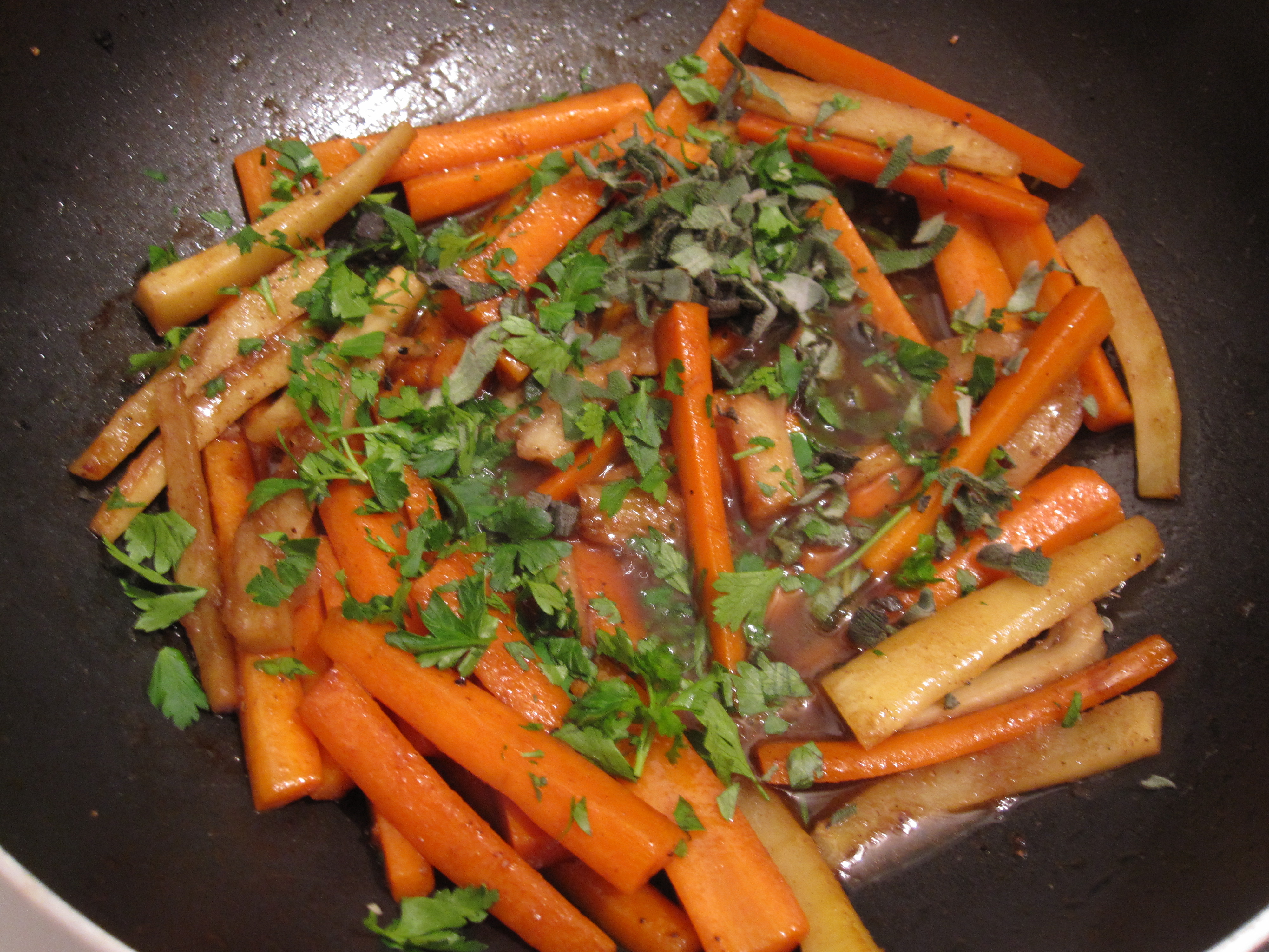 Heat oil and butter in a large skillet and add the carrots and parsnips.