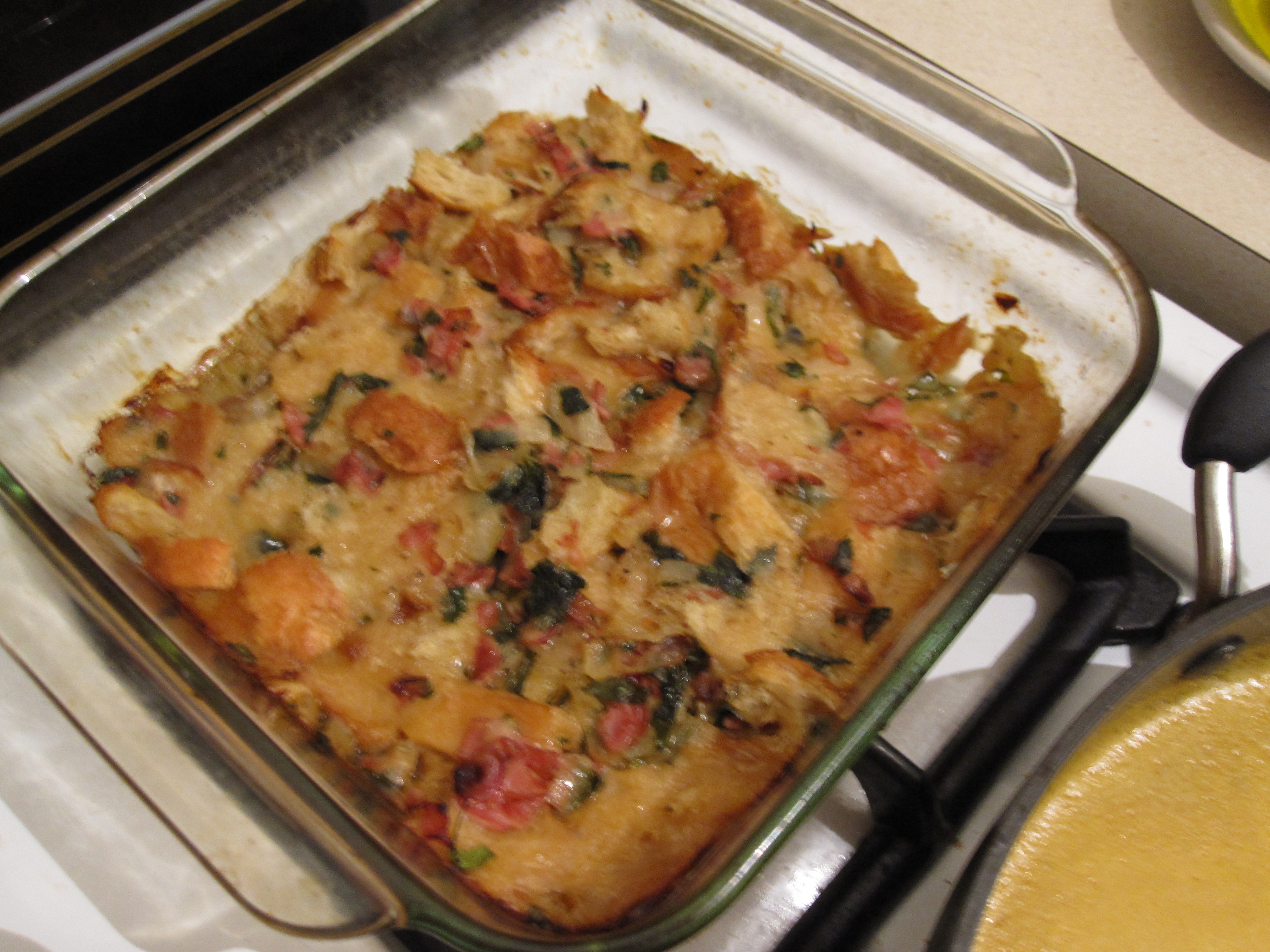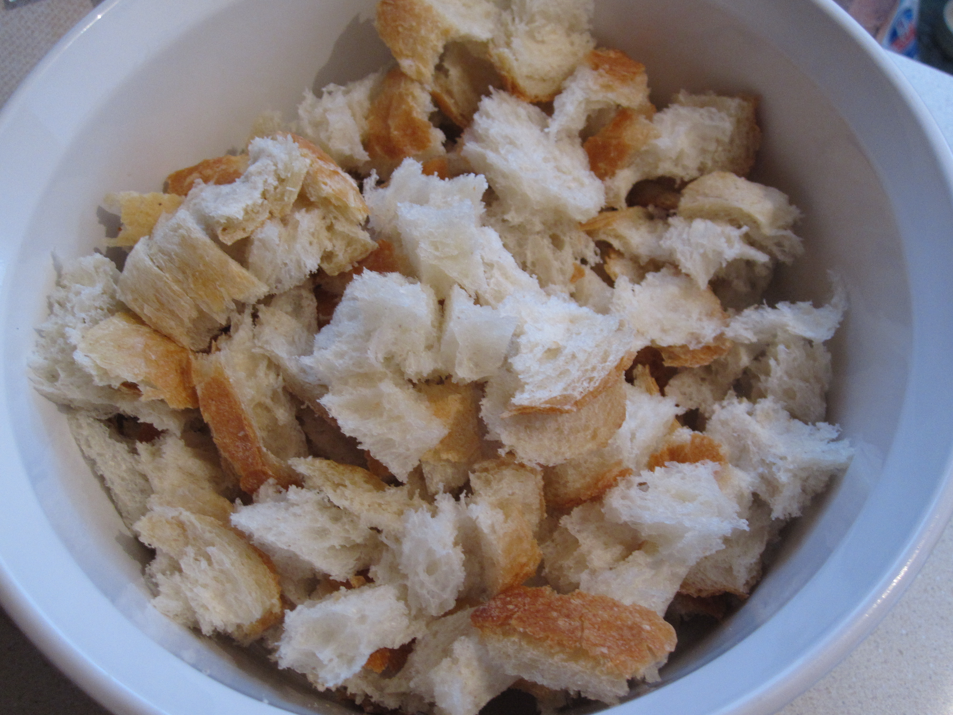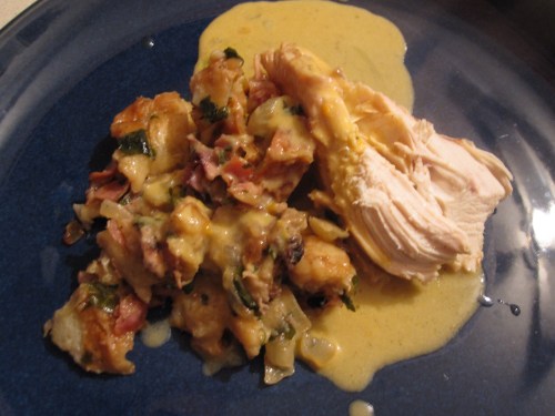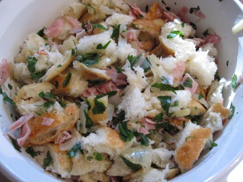 The bread. I used a ‘Tuscan White’ from Giant Eagle and ripped it up into 1″ pieces. I used some of the schmaltz to saute some onions (the recipe also called for celery but I omitted it for G) until they were translucent and soft. I tossed these with the bread along with some chopped ham, some fresh parsley and some salt and pepper. The recipe also called for pine nuts and currants- but I omitted these as well.