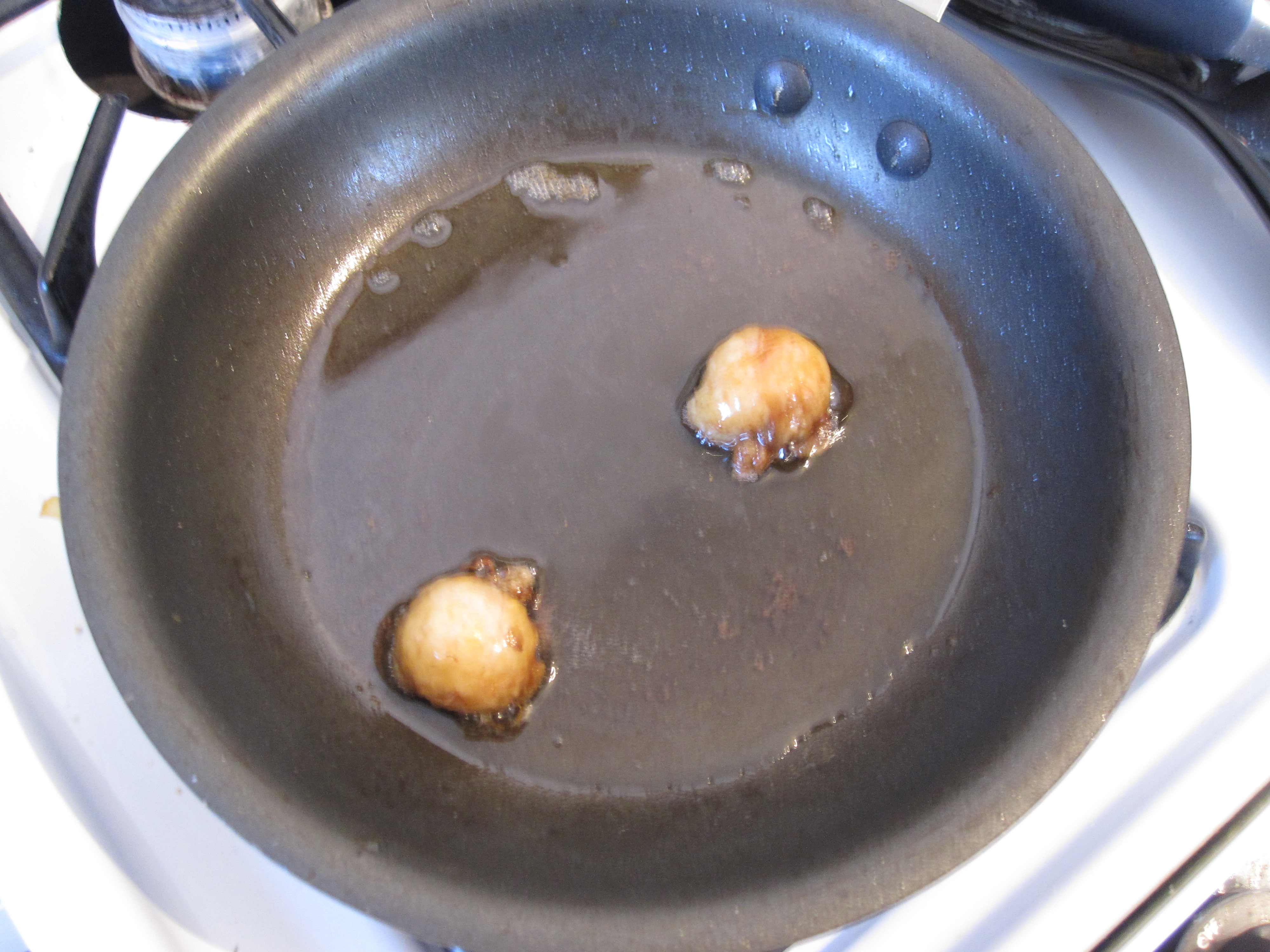You may be wondering what this is. Well, it’s rendering chicken fat AKA schmaltz. These two lumps of fat usually sit in the inner cavity of roasting chickens. Just trim them off and place them in a pan with a teaspoon of olive oil. The fat will melt off slowly and after about 20 minutes you will have a good amount of schmaltz to cook with. The schmaltz gets used in both the stuffing and in cooking the onions and carrots for the braise. If you don’t want to use schmaltz you can use butter or oil in it’s place. I have a feeling though that the use of this contributed to the whole “this is the best thing I ever made” thing. That and the fact that the chicken cooks with bacon on it too! Needless to say this is not exactly diet food 🙂