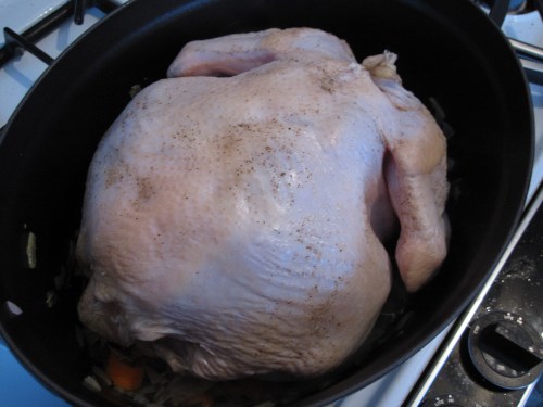 Once the stock comes up to a boil cover the chicken with parchment paper and place the lid on the pot. Cook for 2-2.5 hours, basting every 30-40 minutes. When the meat between the thigh and the breast reaches 170 degrees it is done.