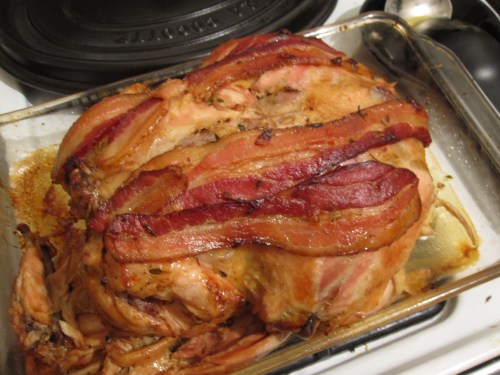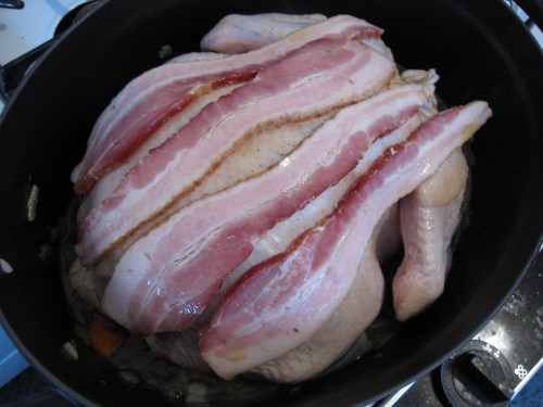 Recipe for Braised Whole Chicken with Bread Stuffing and Bacon