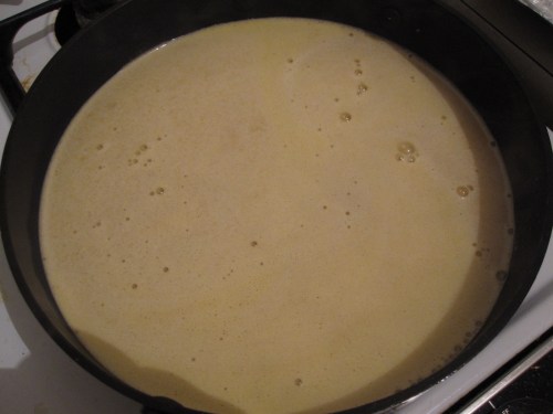 Meanwhile make the sauce… first tilt the pan and try to remove as much fat as easily possible. Retrieve the bay leaves, lemon zest, wing tips, neck, gizzard, and heart and then transfer the vegetables and cooking juices to a blender. Puree until smooth and transfer to a saucepan. Add a little bit of cream (we used half n half) to give it a nice creamy texture and reduce it until you are happy with the consistency.
