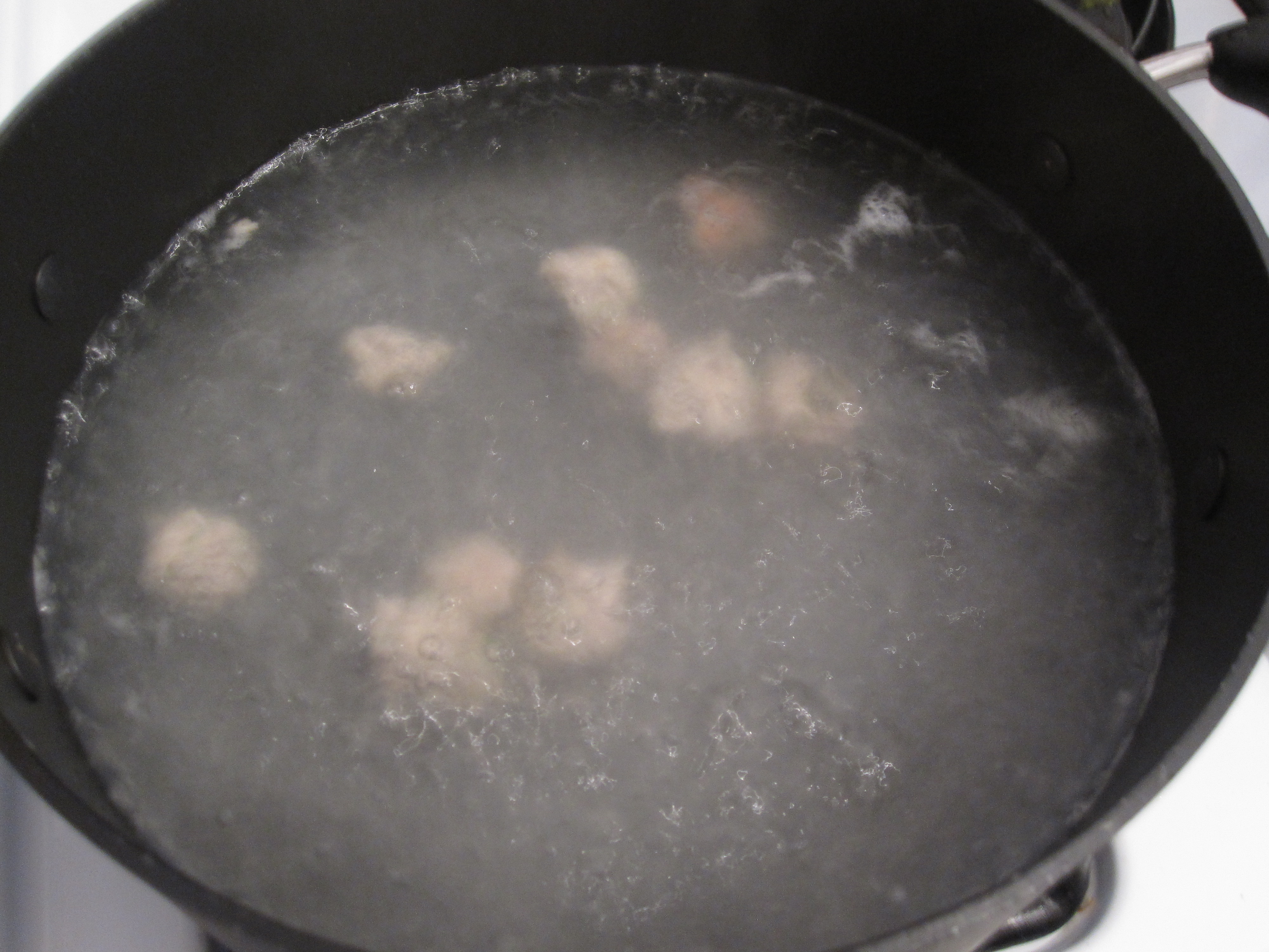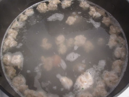 Poach the meatballs in boiling water for a few minutes and transfer them to the soup for a last half hour simmer or more.