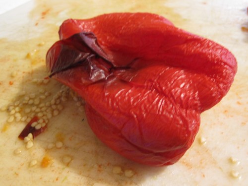 Then place in a container with a lid or sealed plastic bag to cool and also steam the skins off. Once they are cool enough to handle, peel the skins off and remove the seeds and stems.