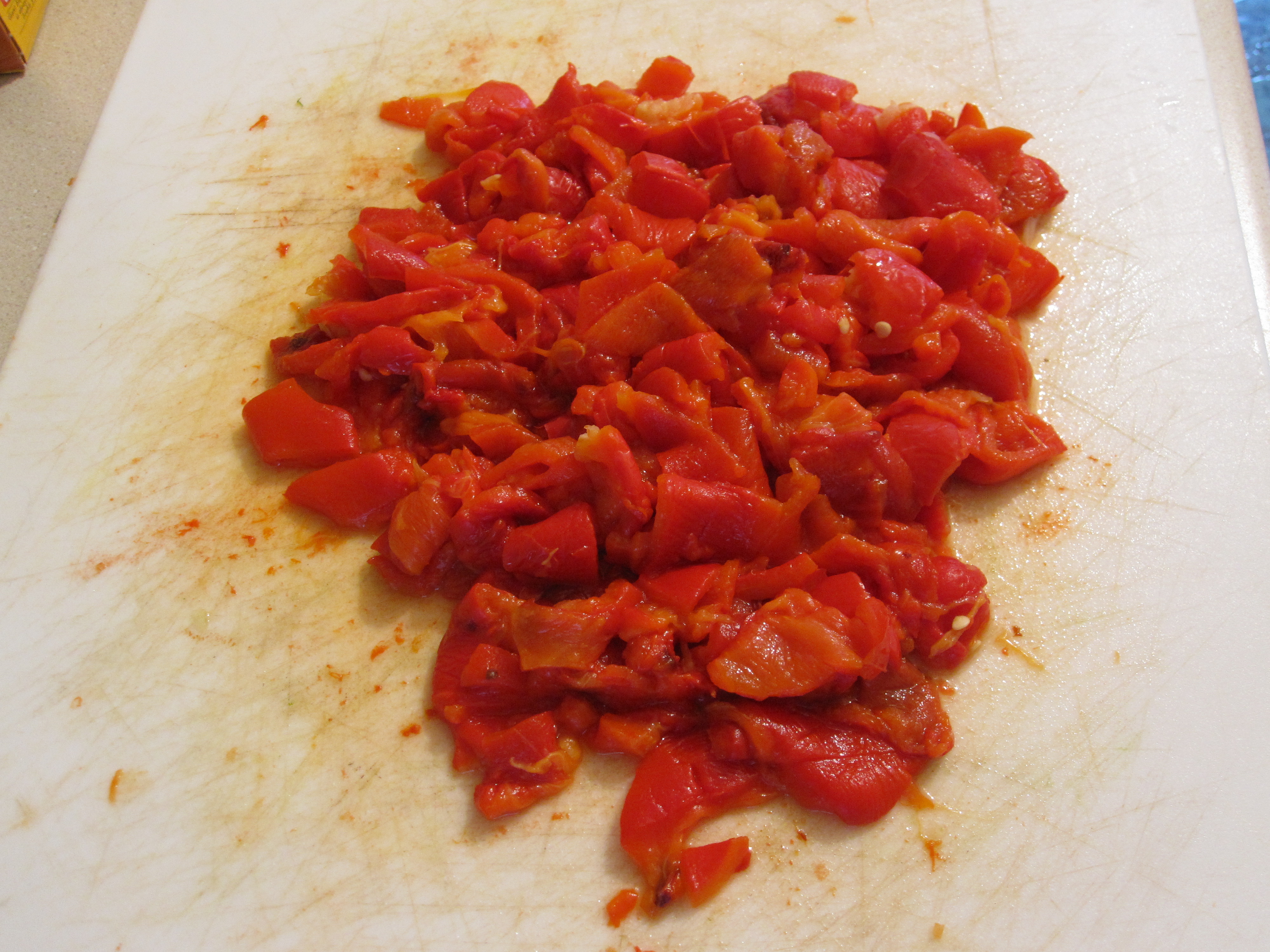 Chop the red peppers and then add them to the browned vegetables with cayenne and continue to saute.