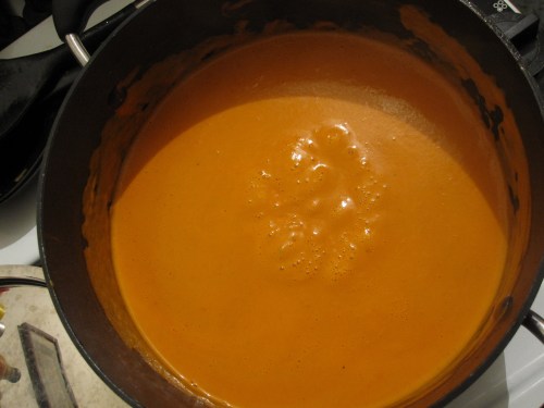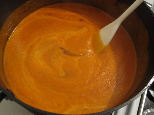 When the blended mixture is returned to the pot, apply heat and and add the cream while continuing to stir.