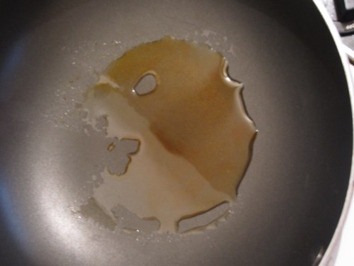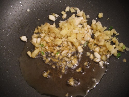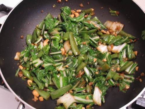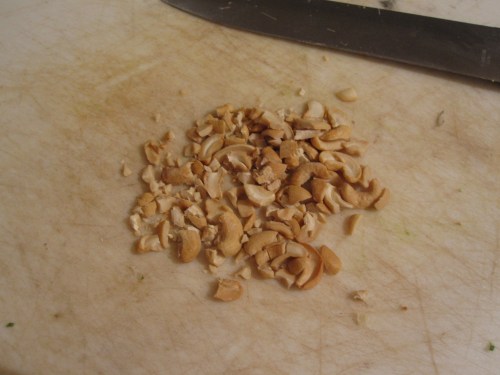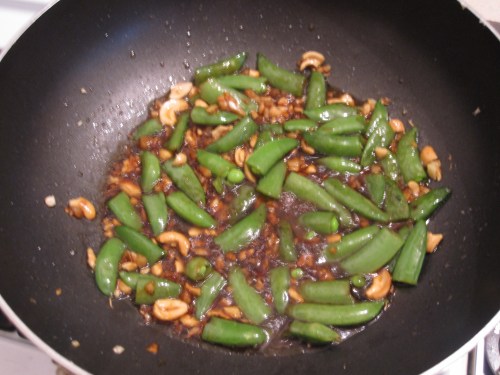I got the last minute idea adding some roughly crushed cashews that we had in the cupboard. The canned bamboo shoots and sliced water chestnuts that I planned to use are still in the unopened and forgotten cans on the counter. When adding the cashews, I added some rice wine vinegar and soy.