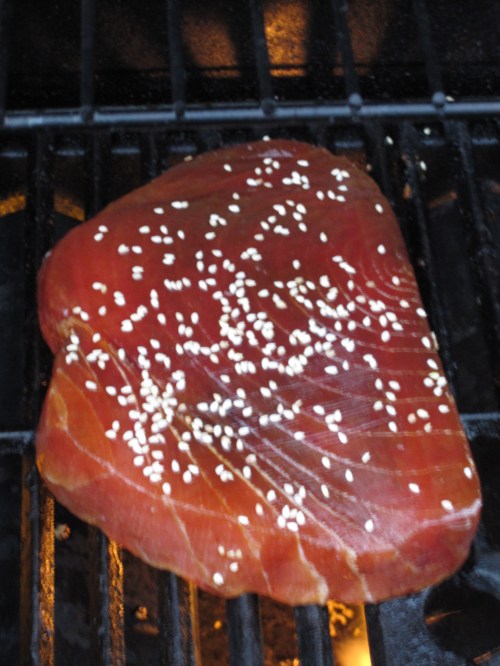 I started by marinating a tuna steak in soy, siracha, and sesame oil which I have really been into recently. After marinating for about an hour, I sprinkled with sesame seeds and got to grilling/searing.