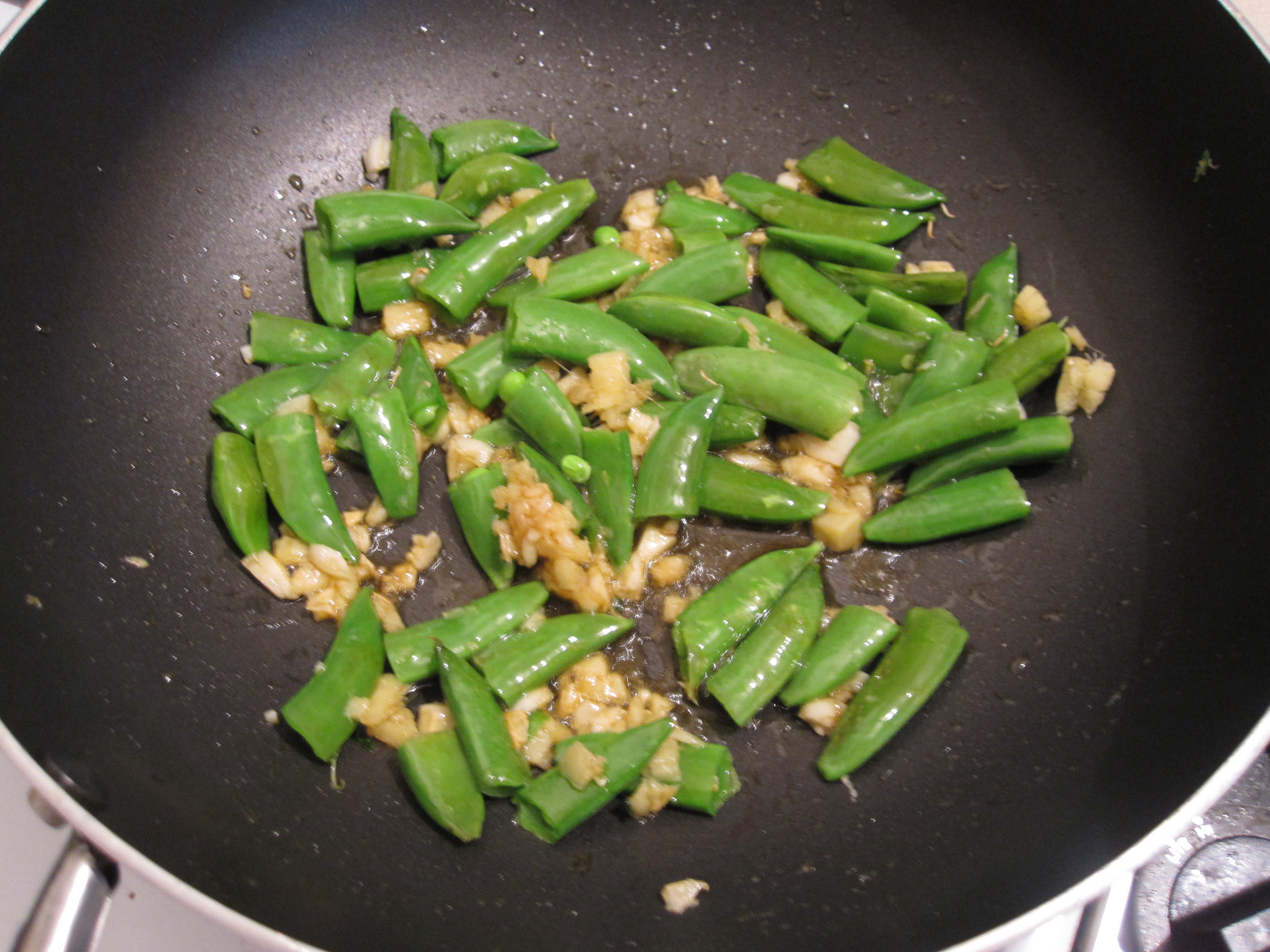 Once these sauteed for a few minutes, add snap peas and continue to stir fry on high heat.