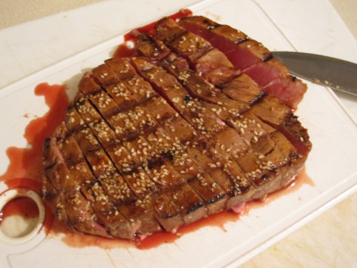 After some more stirring and frying, this part was pretty much done at this point and it was time to assemble. First, the somewhat cooled tuna was sliced and still let off quite a bit of juice and may have been a bit too rare for the liking of some but was right up our alley!