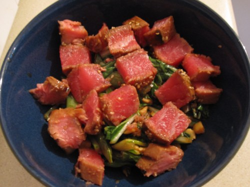 Then just put some stir fry in a bowl and top with sliced tuna.