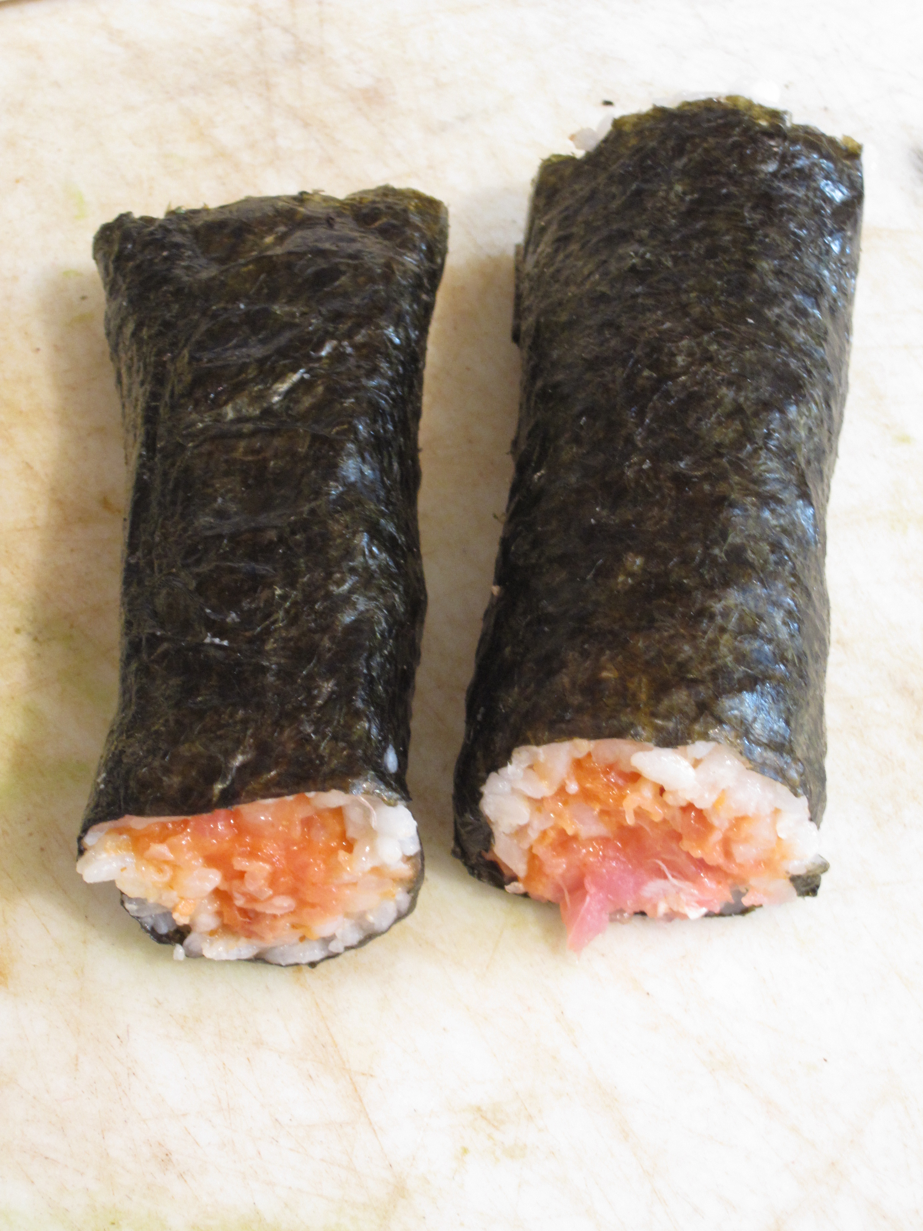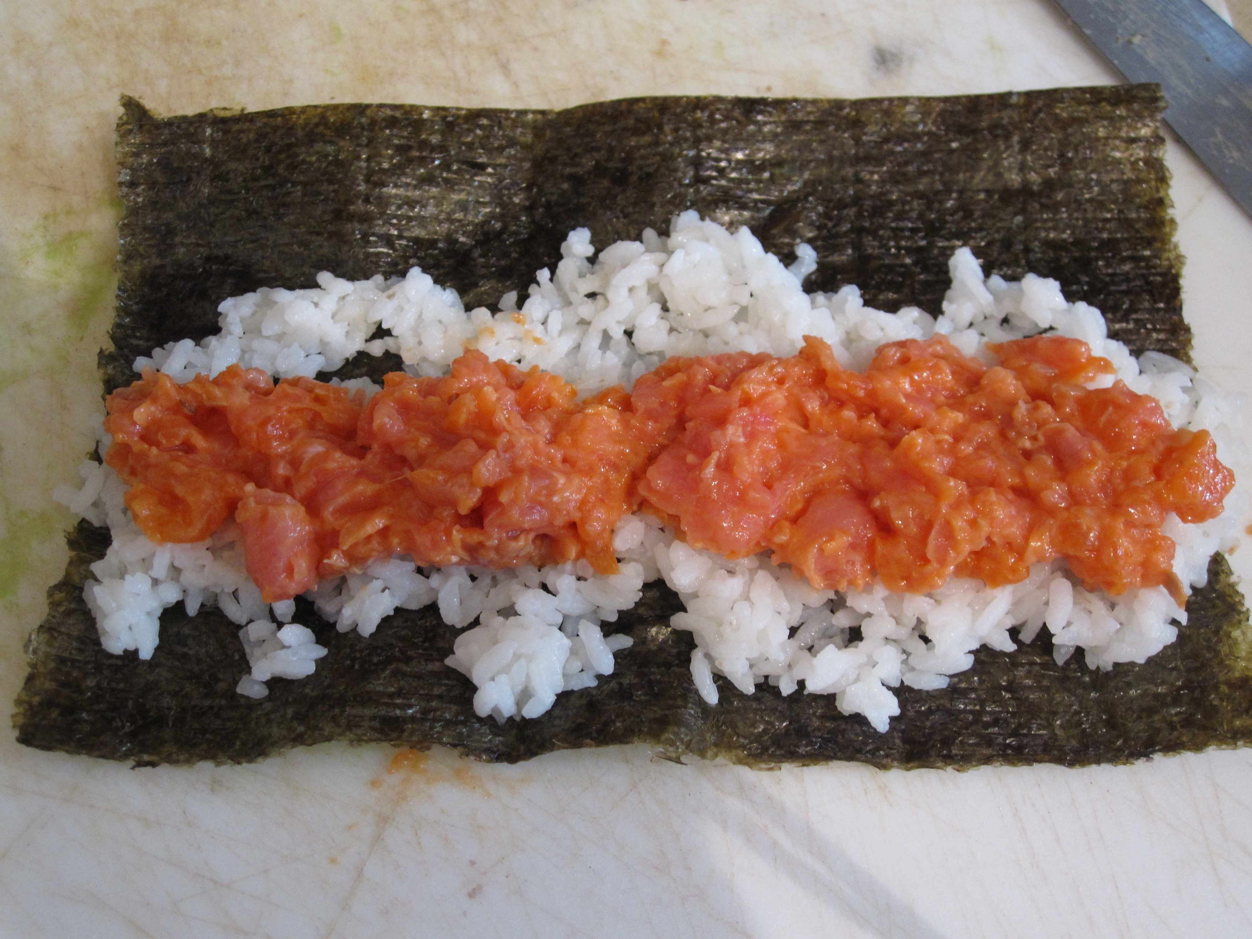 Start with the filling. As in the restaurants, these were basically the scrap pieces chopped up and mixed together. When I say scrap, I don’t mean pieces that you or possibly even a dog shouldn’t be eating but the edges and other slivers that are trimmed off of nigiri pieces and roll slices. This is a bit oranger because of the salmon though it was a bit heavier on the tuna. Siracha and mayo mixed in. Then to the assembly
