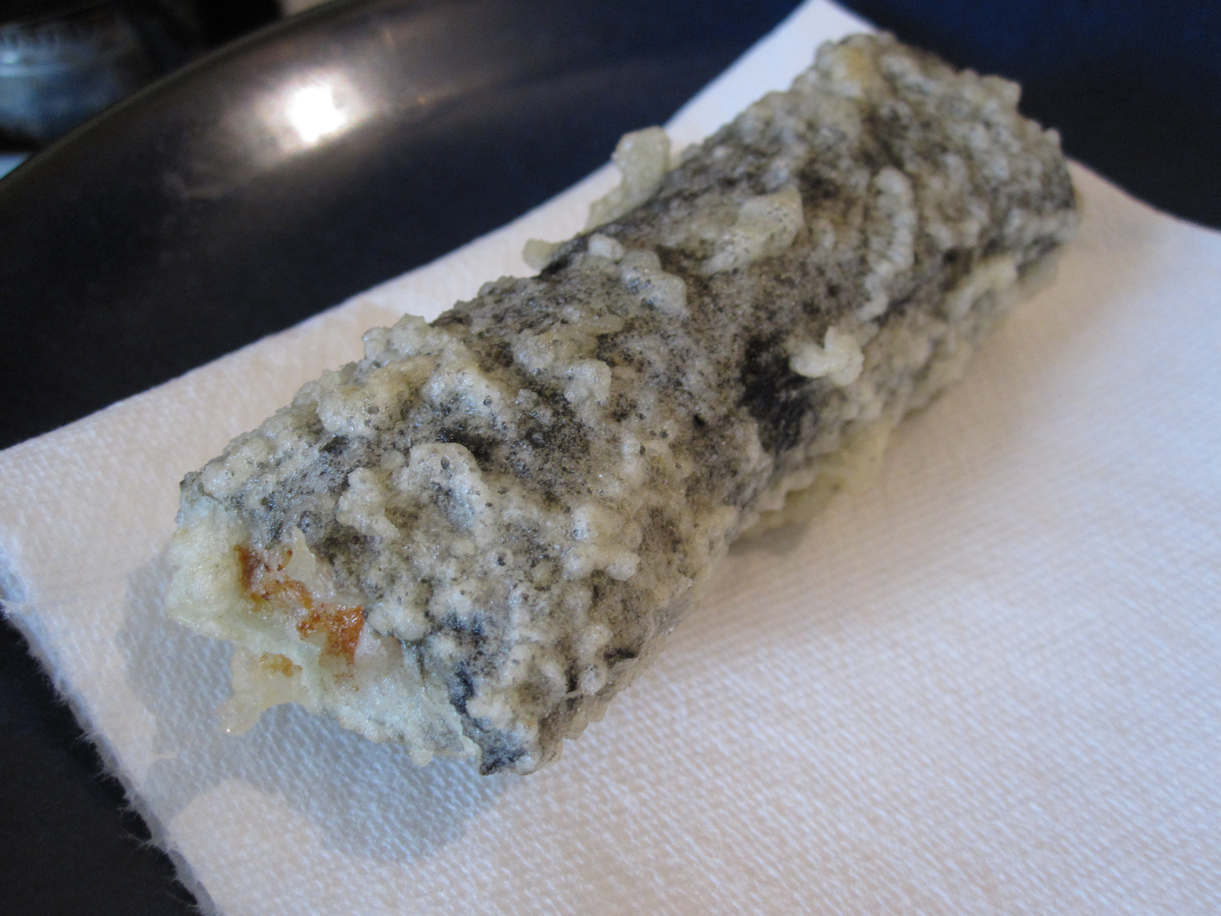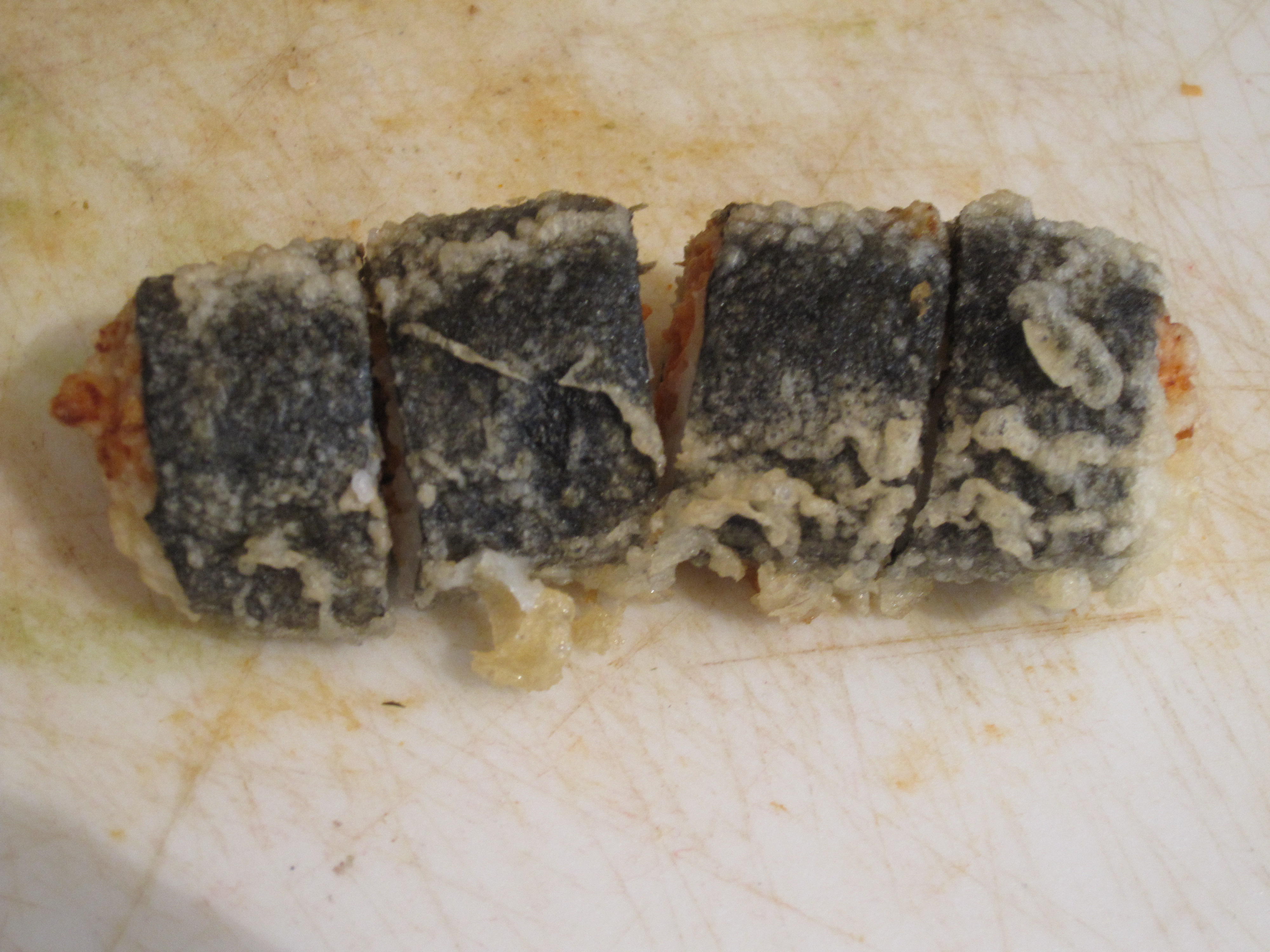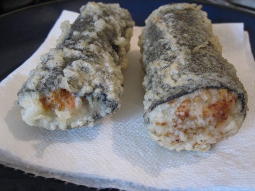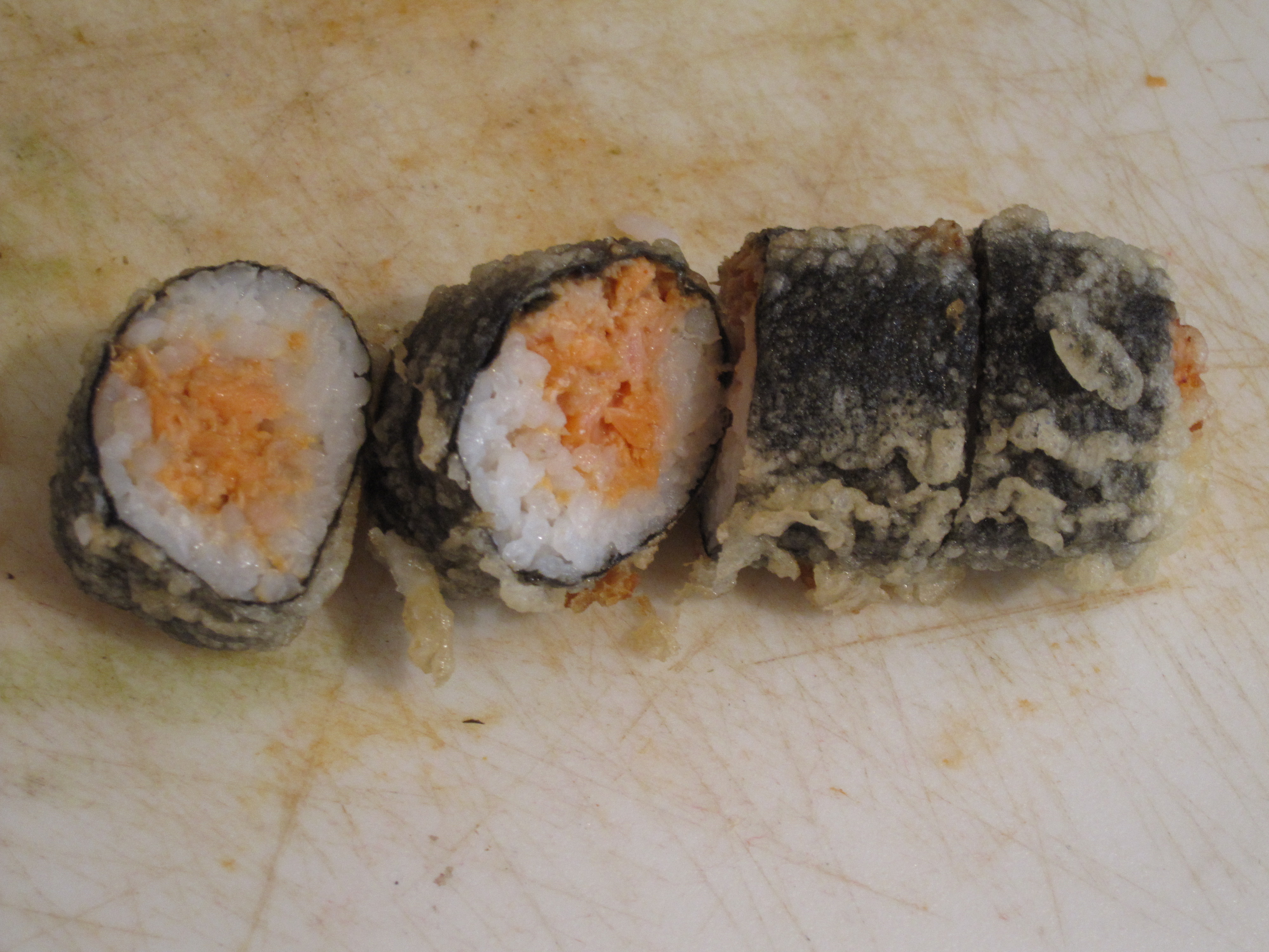 Homemade sushi! It is not easy, but I am getting better. We have featured most of these other rolls before with a new guest this time of spicy tuna and salmon tempura roll. Also, this was about $12 worth of fish which shows you the mark up in restaurants, but again it is not easy and nice when someone really good and quick does it for you. Anyway, spicy tuna and salmon tempura roll!