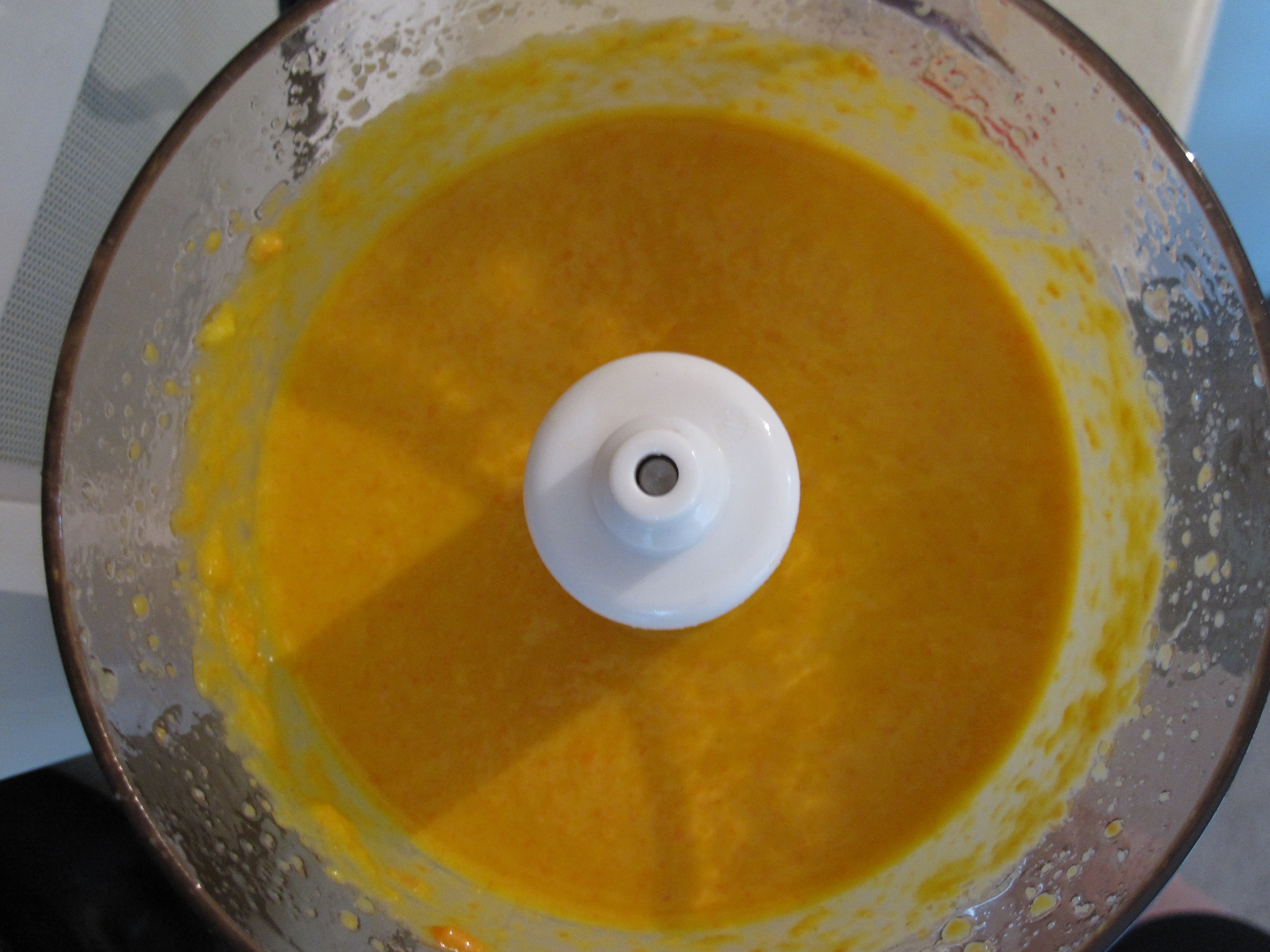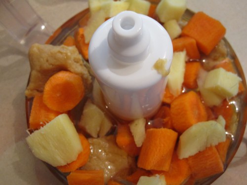 In the food processor is miso paste, rice vinegar, sesame oil, vegetable oil, ginger and carrots. Everything is roughly chopped so it takes all of a few minutes to get everything prepped and measured.